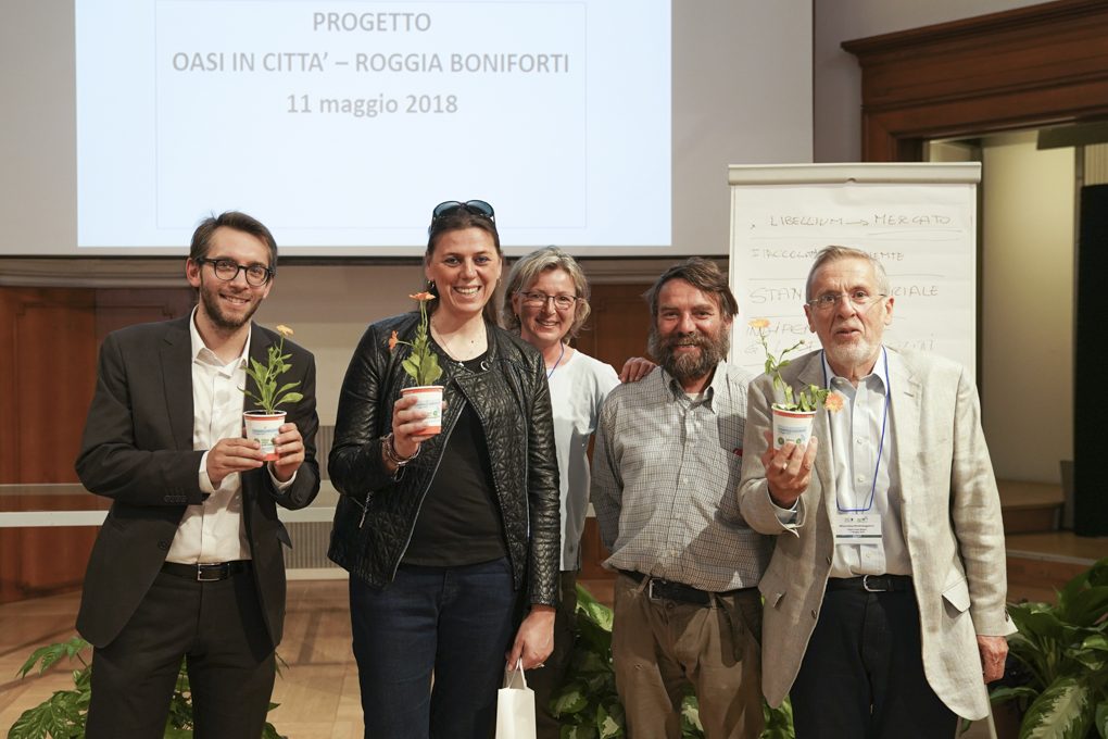 Foto di gruppo con calendula. Da sinistra: Assessore Maran, Prof. Cristina Pasqualini – Università Cattolica del Sacro Cuore, Cristina Protti, volontaria del Parco, Silvio Anderloni – Direttore del CFU/Italia Nostra, Pres. Riccardo Casalegno – Associazione Parco Segantini.