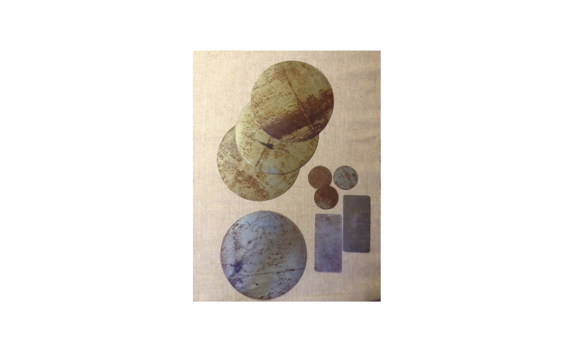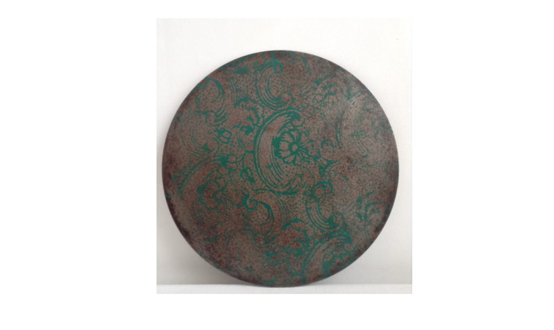 Finiture ossidate anche sulla tavola. I sottopiatti di ferro ossidato, successivamente decorati e protetti, sono compatibili con gli alimenti. Sono disponibili in set di varie misure e colori, rotondi o quadrati [SauveSimen, a partire da € 30].