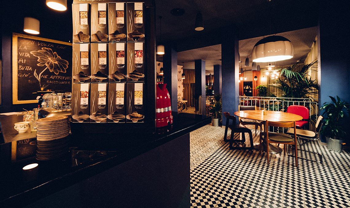 E Filippo ha sempre voluto aprire un locale che fosse come una casa: questo è stato il punto di partenza dal quale lo Studio Rotella ha sviluppato il progetto. Infatti il grande ambiente è diviso in aree diverse proprio come una casa e, grazie alla scelta di arredi e finiture dal sapore vintage appena si entra si respira proprio un'atmosfera casalinga. Qui si sta bene, si condividono i vari momenti della giornata dalla colazione alla cena come in un accogliente nido domestico.