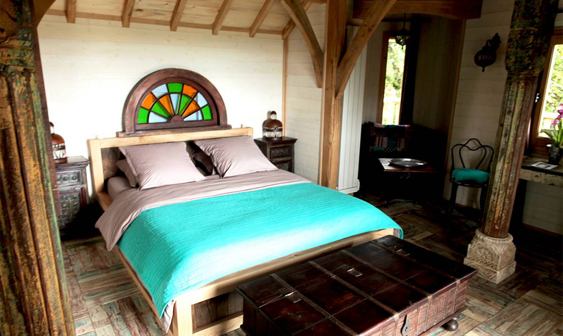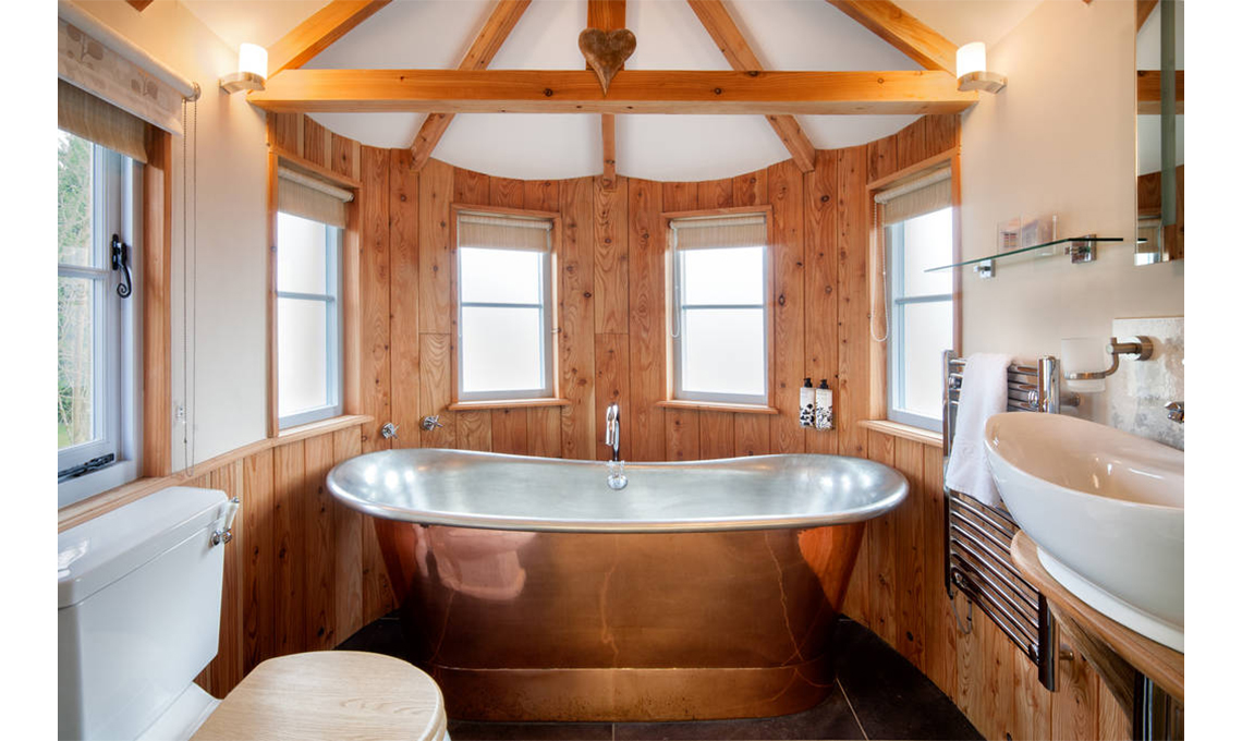 Chulmleigh, nel Devon (Regno Unito): stanze comunicanti su più piani, progettate attorno ai rami. E nel bagno una grande vasca di rame! (Foto: canopyandstars.co.uk)