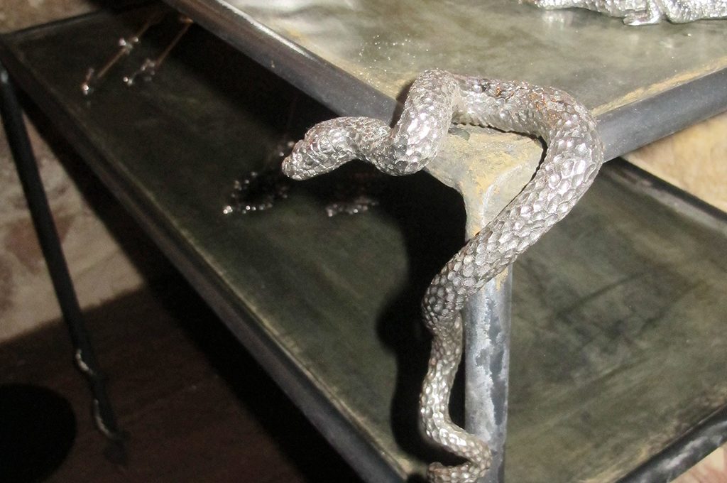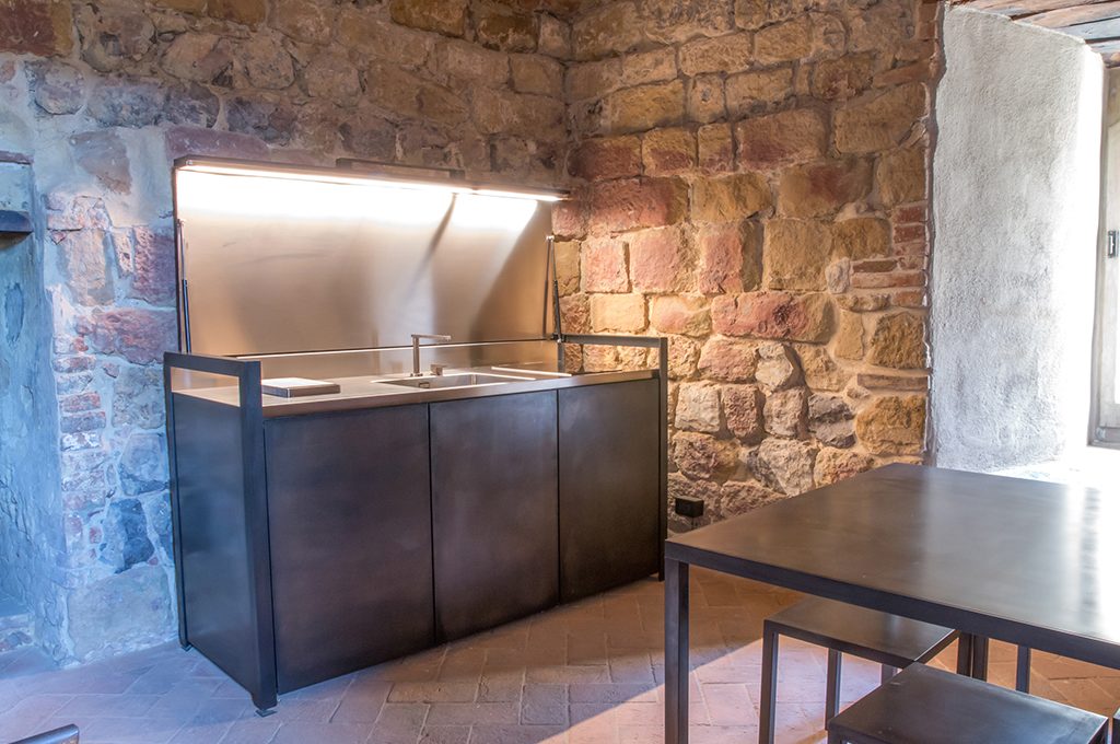La cucina monoblocco di lamiera brunita e super-accessoria nonostante le dimensioni minime, è stata realizzata, come tutto il progetto di ristrutturazione della torre, dall'architetto Mauro Procino con un team di giovani architetti