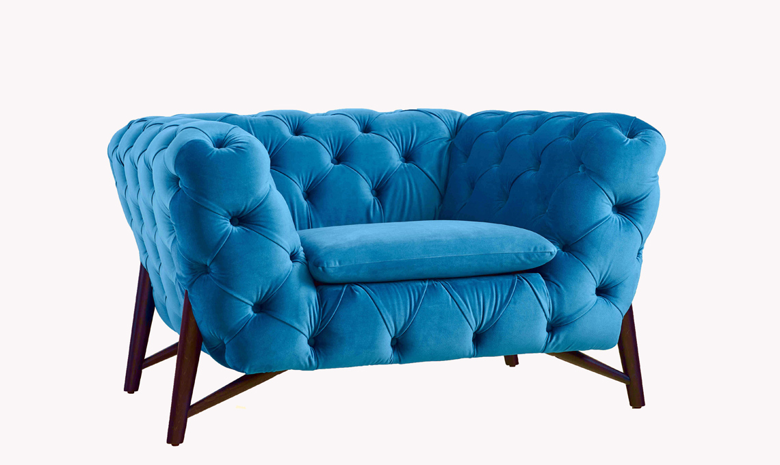 Divano letto Elvis a tre posti in velluto blu, disponibile anche in verde [Maisons du Monde, cm h84x214x87 €370].