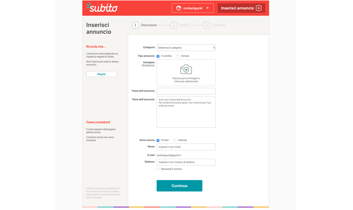 2. Vai su www.subito.it, clicca “inserisci annuncio“ e registrati. Ora puoi iniziare a creare il tuo annuncio. Trovi macro categorie (es. ‘per la casa e la persona’) e delle sottocategorie (es. ‘arredamento e casalinghi’): scegliere la categoria giusta per il tuo oggetto aumenta le sue possibilità di essere trovato in modo rapido da chi sta cercando proprio quella cosa, fai quindi molta attenzione.