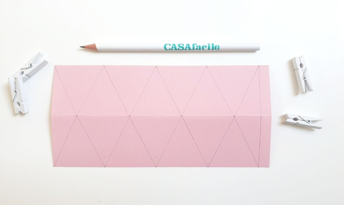 - Piegare lungo le linee segnate, utilizzando come aiuto il righello posizionandolo sulle diagonali tracciate e piegando verso di sé la carta.