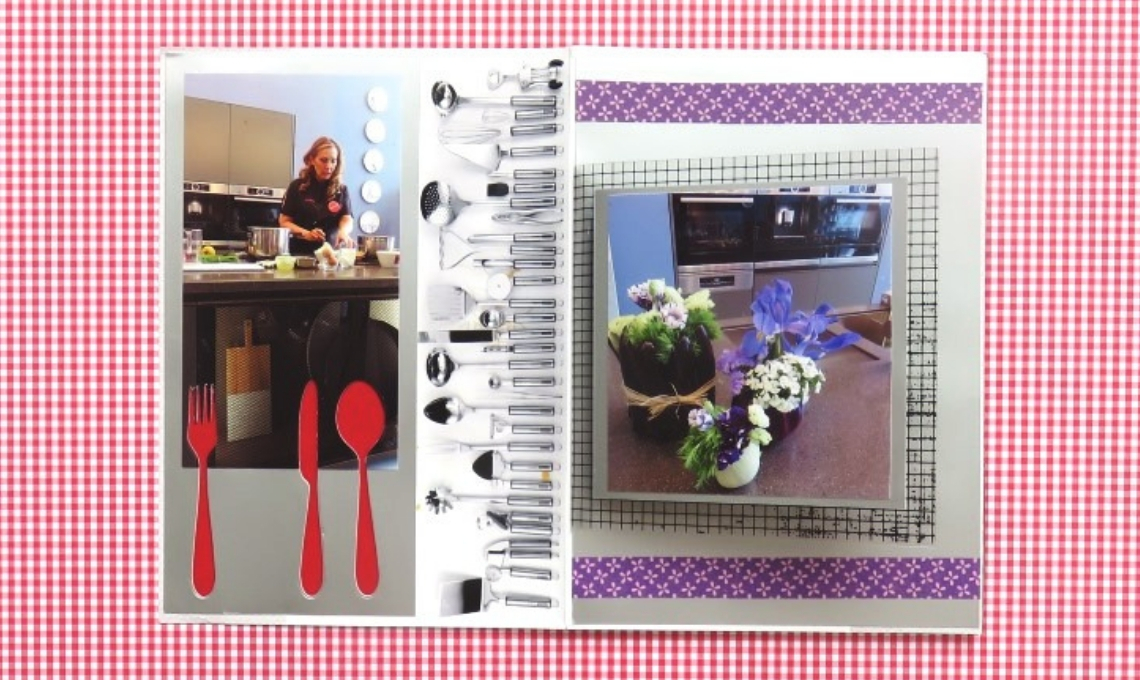 Nella seconda pagina ho tenuto a vista gli attrezzi, coprendone i codici con la fotografia e il decoro tridimensionale. Le posate sono intagliate nella foto e nel cartoncino argento e mostrano il cartoncino rosso applicato sotto.