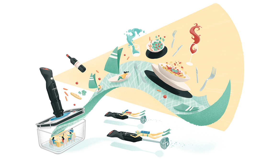 L'illustrazione del frullatore che mette anche sottovuoto è opera di Andrea De Santis, (su Instagram: @andreadesantisillustrator).