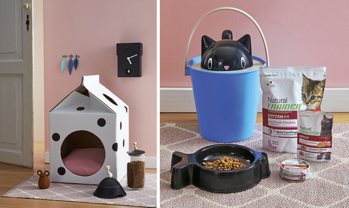 Hai creatività da vendere… o regalare? Partecipa al concorso e all’iniziativa solidale Let’s Help di Natural Trainer! Nel testo sotto trovi tutte le informazioni e il regolamento. Nella foto: cuccia fai-da-te che ricorda la forma del cartone del latte, ciotola e barattolo Alessi, secchiello porta-crocchette, ciotola a forma di pesce e topino United Pets, crocchette Natural Trainer, tappeto e orologio Jannelli e Volpi Store. Styling Elisabetta Viganò e Cristina Dal Ben (wunderlab.it), foto Andrea Baguzzi