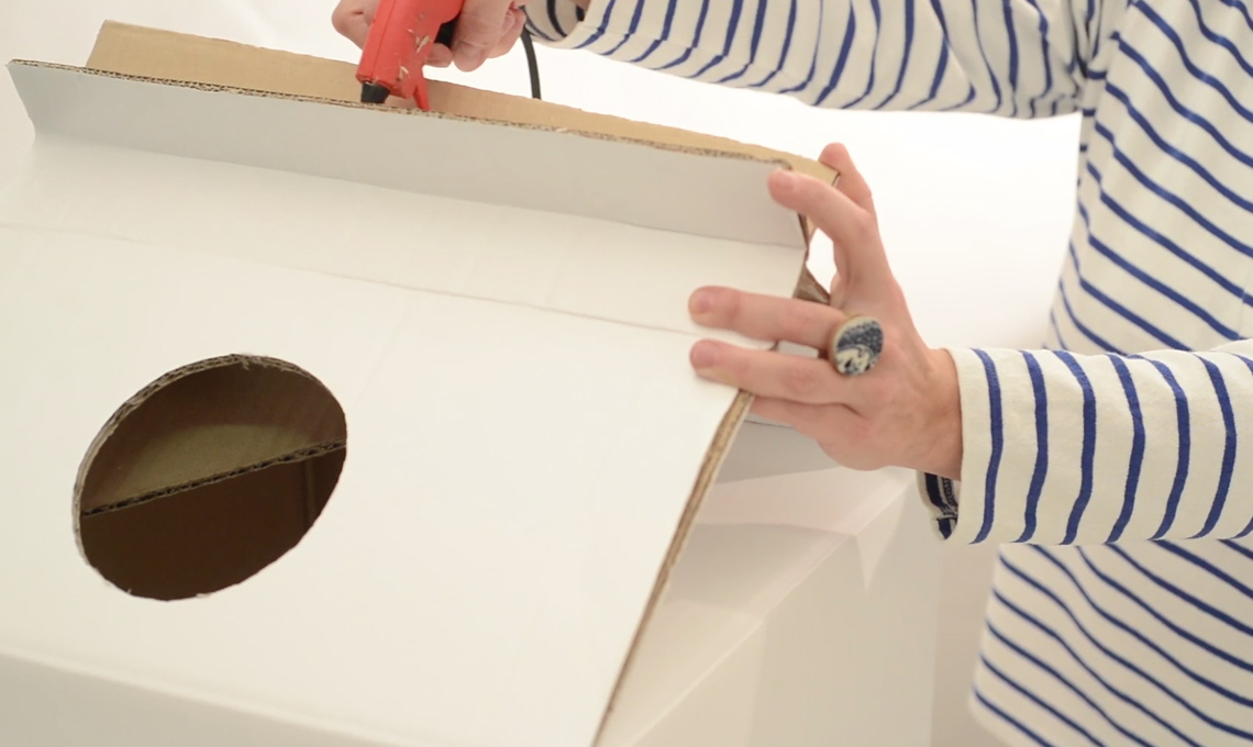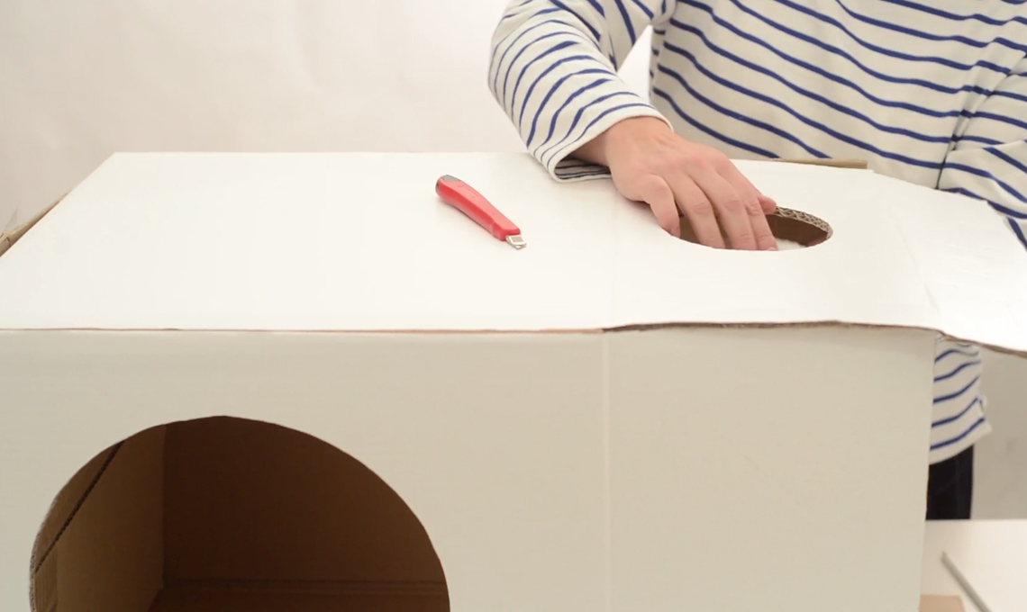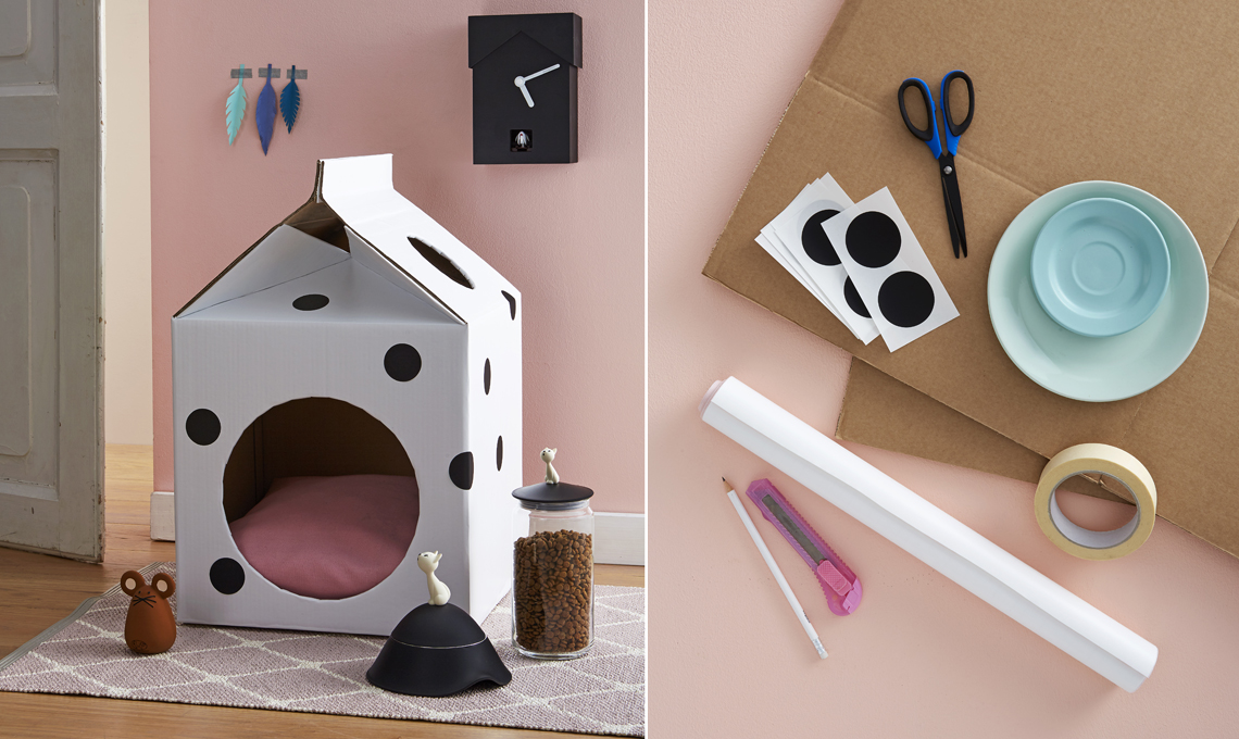 Segui il video tutorial per realizzare la cuccia fai-da-te! Trovi il video in fondo al post (scorri verso il basso). Nella foto: cuccia fai-da-te che ricorda la forma del cartone del latte (a destra l'occorrente per realizzarla), ciotola e barattolo Alessi con crocchette Natural Trainer, topino United Pets, tappeto e orologio Jannelli e Volpi Store. Styling Elisabetta Viganò e Cristina Dal Ben (wunderlab.it), foto Andrea Baguzzi