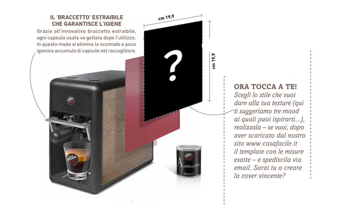 Ma c’è di più: puoi diventare designer, creare una ‘tua’ cover per questa macchina ed essere tra i 3 fortunati che la vedranno realizzata! E contribuire a dare vita alla ‘Casafacile e Caffè Vergnano limited edition’. Partecipa al concorso!