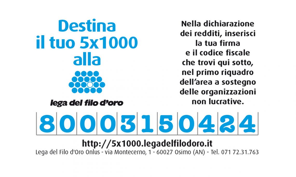 Puoi devolvere anche il tuo 5x1000: nella dichiarazione dei redditi, inserisci la tua firma e il codice fiscale 80003150424 nel primo riquadro dell'area a sostegno delle organizzazioni non lucrative.