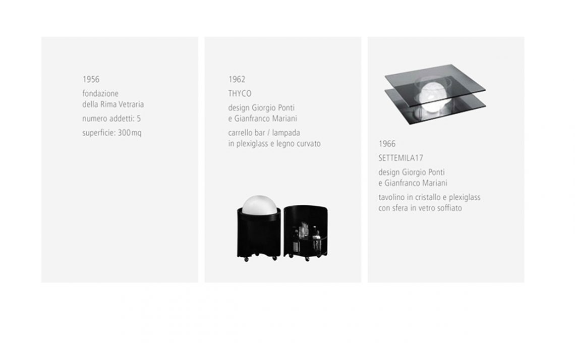 Nel 1956 nasce la 'Rima Vetraria' per iniziativa di Francesco Malberti e Luigi Riboldi: la prima sede è a Desio, nella laboriosa e creativa Brianza monzese, e questa azienda lavora un materiale semplice ma prezioso, il vetro per l'arredamento. Mani sapienti lisciano, trasformano, incidono, colorano... e sessant'anni dopo è ancora il vetro il protagonista indiscusso dei prodotti Rimadesio (abbinato all'alluminio, lega metallica riciclabile al 100%,), oggi realizzati interamente nella sede di Giussano con tecnologie d'avanguardia in totale sicurezza.