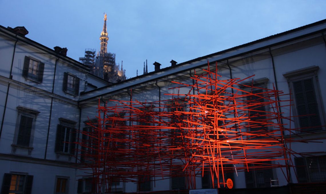 Efficace e scenosissima è anche l'installazione di Attilio Stocchi nel cortile. Tutta rossa, grande, ci si va dentro...
