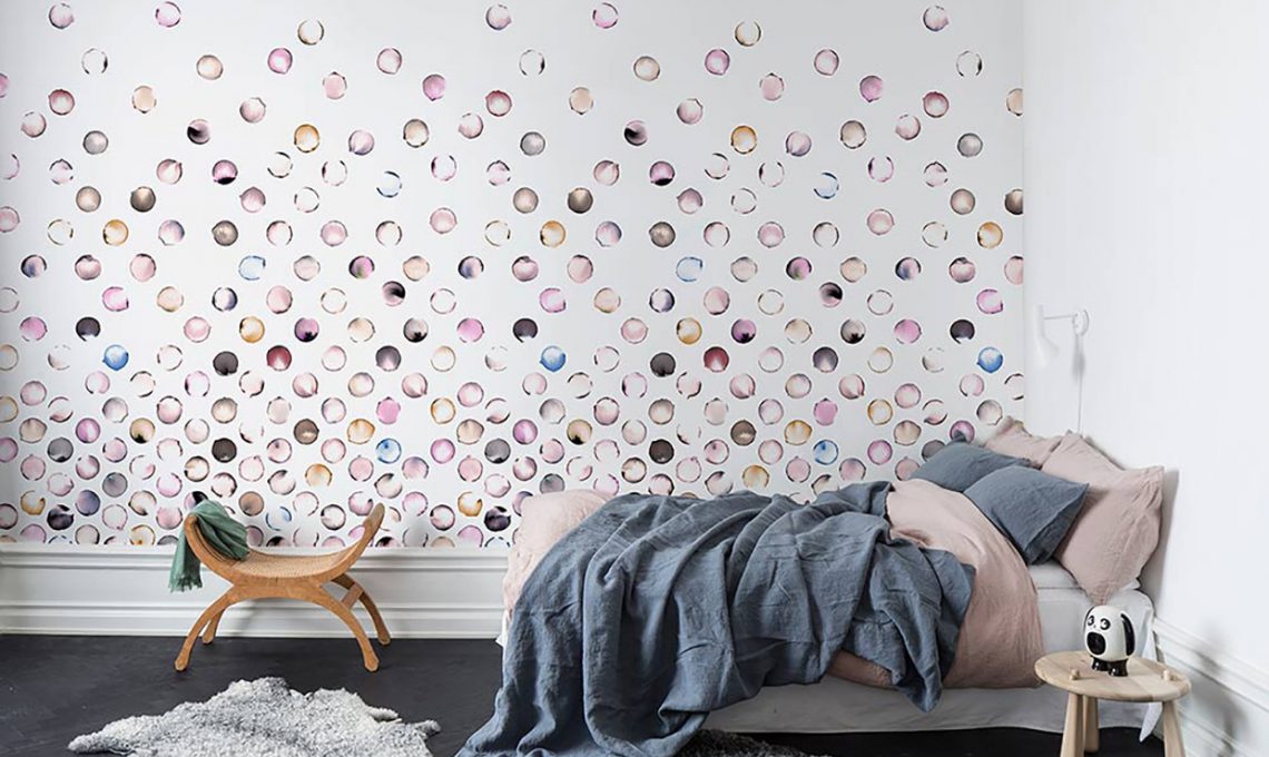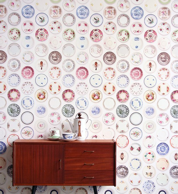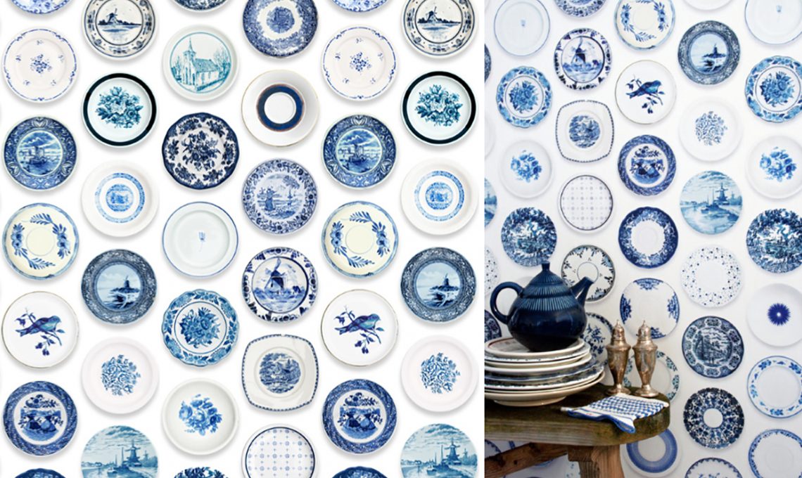 Sembra una parete piena di piatti decorativi. Invece è una carta da parati!
