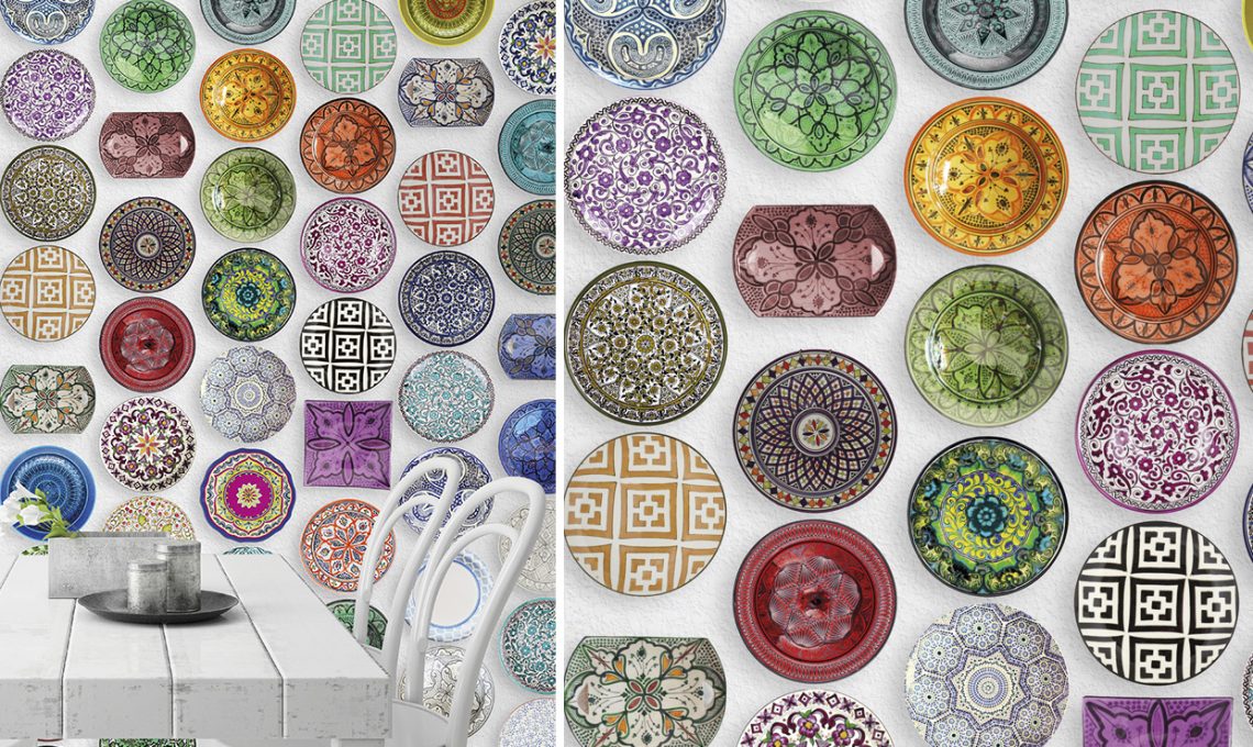 Piatti multicolor per la carta da parati Casablanca [Wallpepper, larghezza rollo cm 57 € 89/mq].