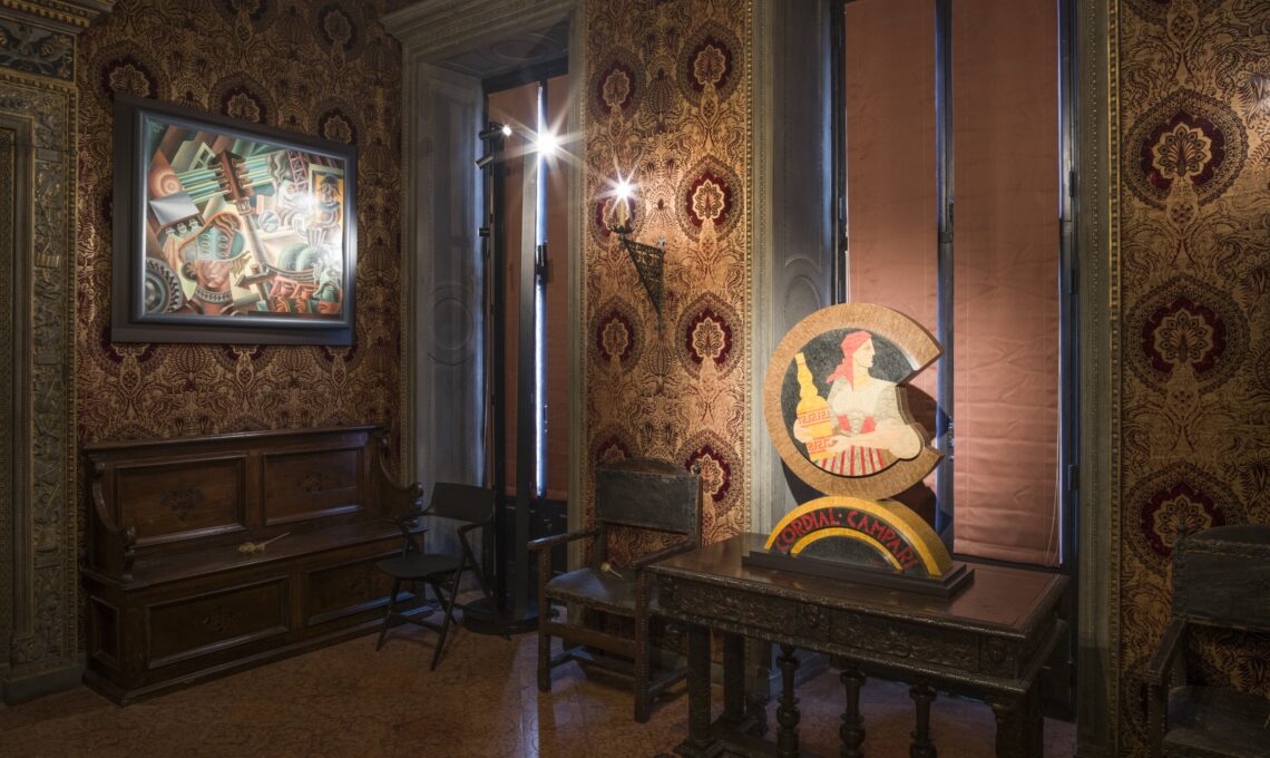 Le opere, provenienti dalla Casa d’Arte Futurista Depero e dal Mart, si inseriscono nella casa museo milanese in un dialogo serrato con arredi, dipinti e arti applicate della collezione permanente. Non si tratta di un semplice accostamento: il progetto di allestimento, firmato dallo studio a-fact architecture factory con il progetto illuminotecnico di LightScene Studio, lavora per integrazione. Le opere “piegano” lo spazio, talvolta sostituendo temporaneamente pezzi storici, talvolta affiancandosi agli arredi come complementi inattesi. Disegni e dipinti trovano posto in nicchie, armadi e passaggi, mentre una regia luminosa chiaroscurale costruisce una vera scena domestica.