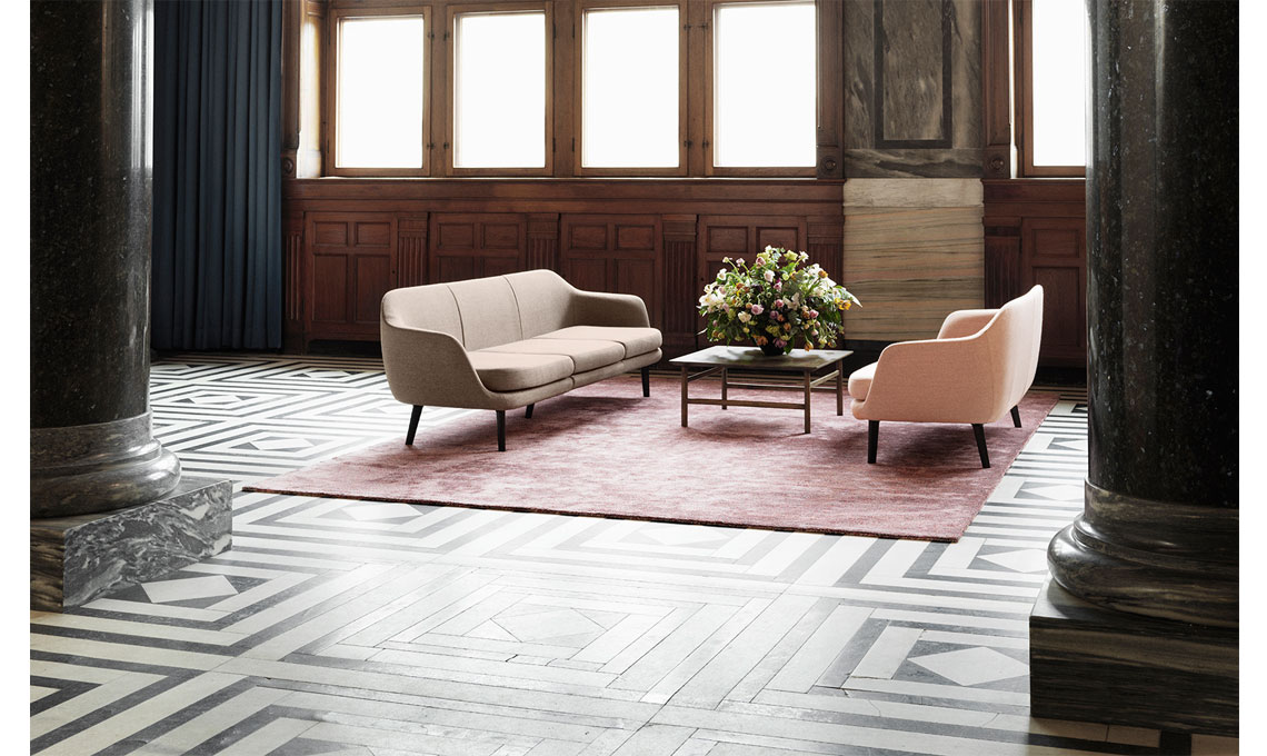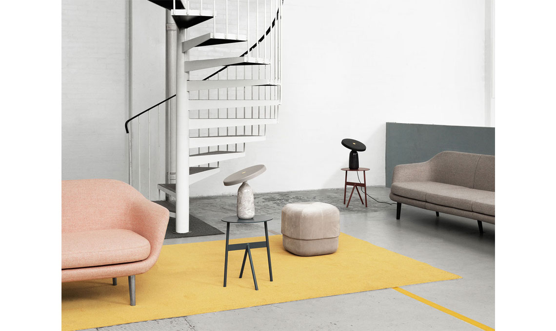 Nuove collezioni di Normann Copenhagen al prossimo Fuorisalone 2018: divano e poltrona Sum, lampada da tavolo in marmo Eddy lamp (Altri: Circus pouf e tavolino Stock table).