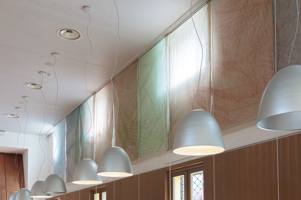Per l'iniziativa 'Ut Unum. Tutti siamo poveri in Bellezza' sulla parete sud del Refettorio Ambrosiano, l'architetto e designer Anna Barbara ha ideato pannelli tessili in toni pastello, con simboli di varie fedi e culture come invito al dialogo. Attraversati dalla luce delle finestre, i leggeri teli sovrapposti mandano riflessi colorati sui tavoloni.
