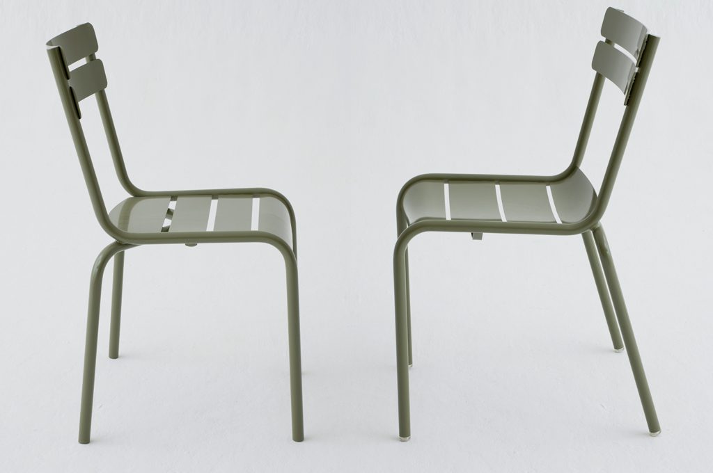 A sinistra la sedia Senat, a destra la Luxembourg ridisegnata da Frédéric Sofia, sempre per Fermob: l'alluminio, più leggero dell'acciaio, rende le sedute facilmente trasportabili e consente di creare delle curvature più ergonomiche.