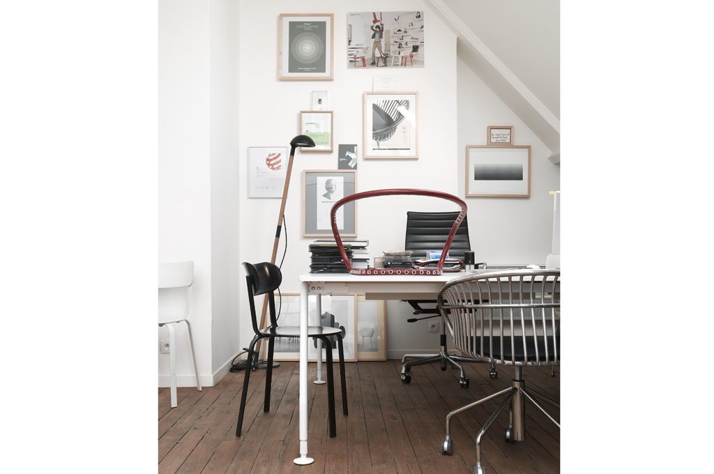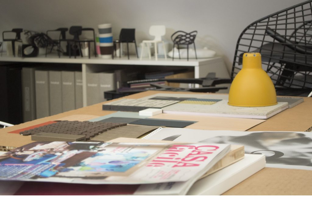 Una foto scattata in studio durante l'intervista: la copia di CasaFacile in primo piano e, sullo sfondo, i modellini delle sedie progettate da Norguet.