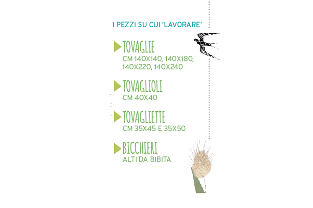 - Gli oggetti per i quali realizzerai una o più texture sono tovaglie (formati: cm 140x140, cm 140x180, cm 140x220, cm 140x240), tovaglioli (cm 40x40), tovagliette all’americana (cm 35x45, cm 35x50) e bicchieri alti da bibita.