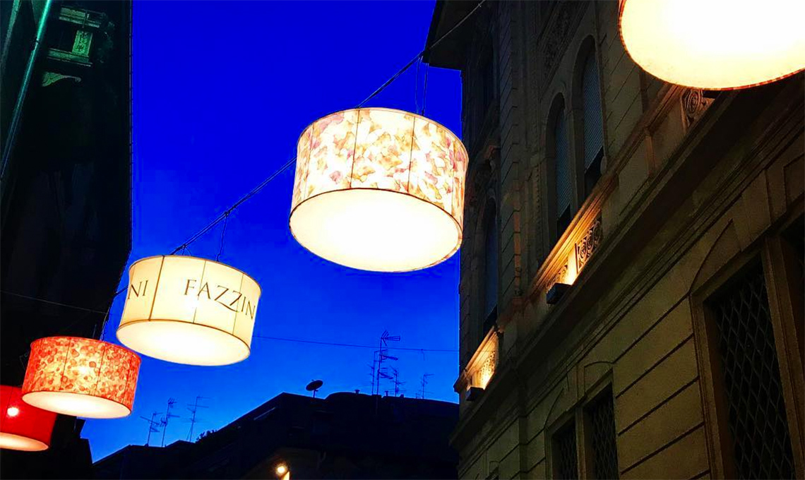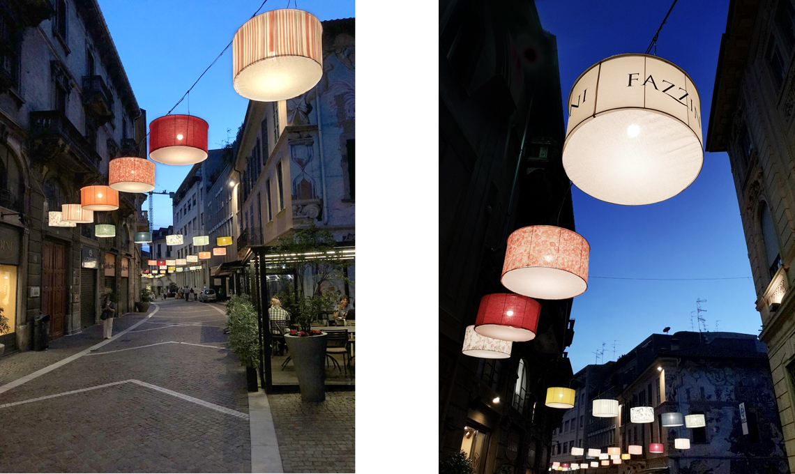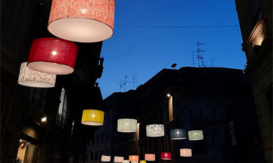 Gallarate si illumina di un percorso di luci che attraversa la città in un susseguirsi di lampade sospese, ricoperte dai preziosi tessuti fantasia di