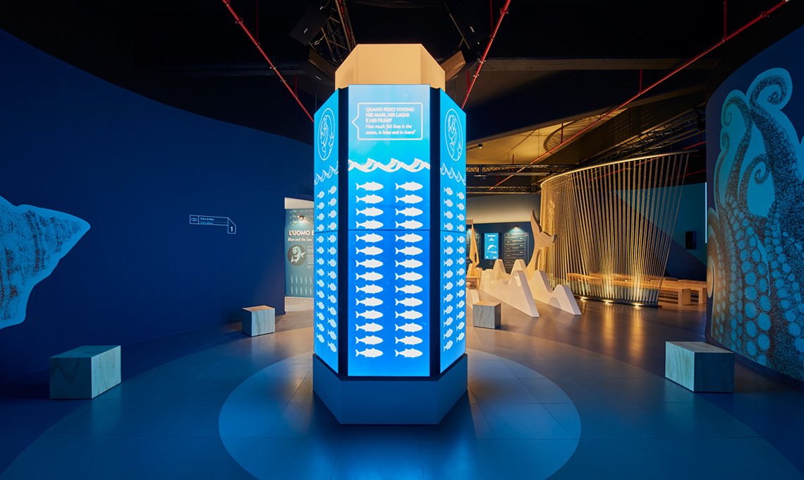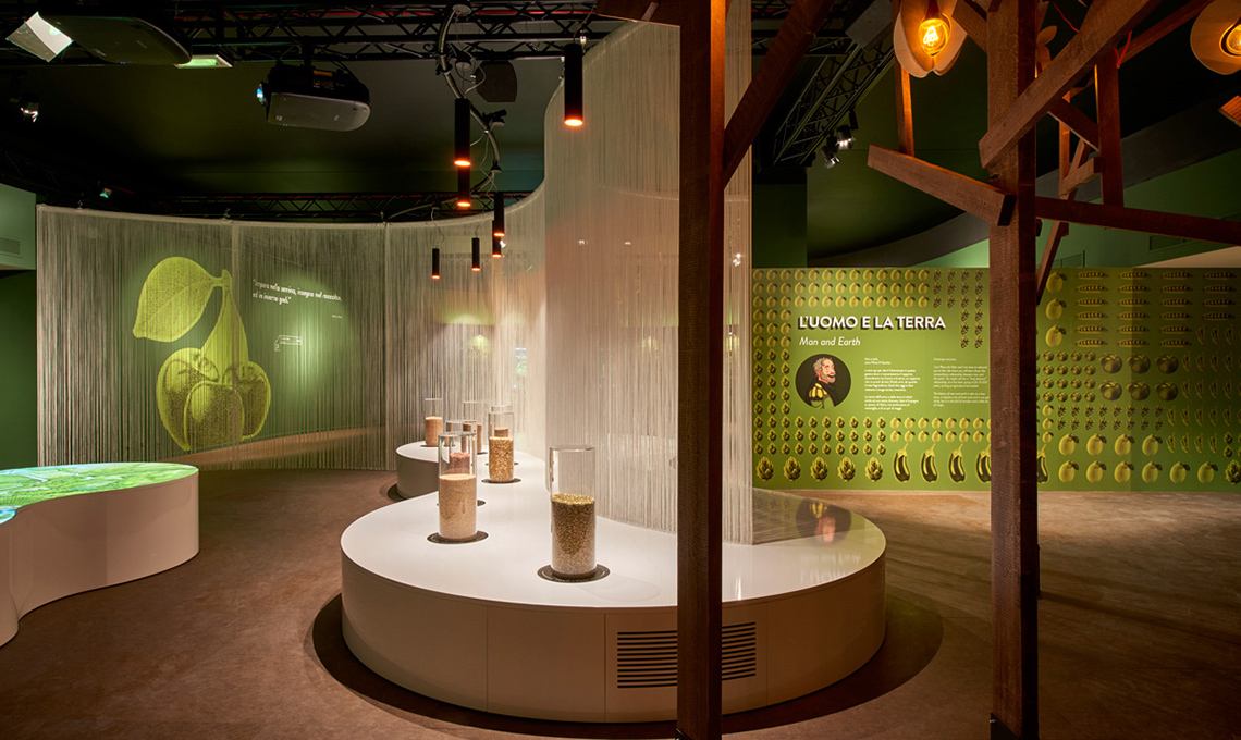 L'allestimento, curato dallo studio milanese Limiteazero e Clonwerk, invita il pubblico a un'esperienza multimediale attraverso cinque mondi diversi in relazione all'uomo: fuoco, terra, animali, mare e produzione di olio, vino e birra, i temi che compongono la biodiversità alimentare italiana.