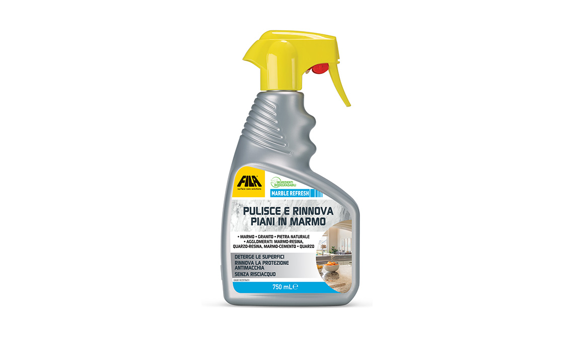 - MARBLE REFRESH, oltre a detergere e pulire la superficie, rafforza la protezione nel tempo ed è l’ideale anche per la manutenzione di top in marmo resina e marmo cemento. Per tutti i piani cucina in grés porcellanato e in pietra sinterizzata è fondamentale usare i detergenti corretti.