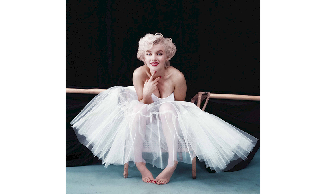 Marilyn Monroe in uno studio fotografico a New York, posa indossando un abito da ballerina firmato dallo stilista Anne Klein. Scatto di Milton Greene, Ottobre 1954.