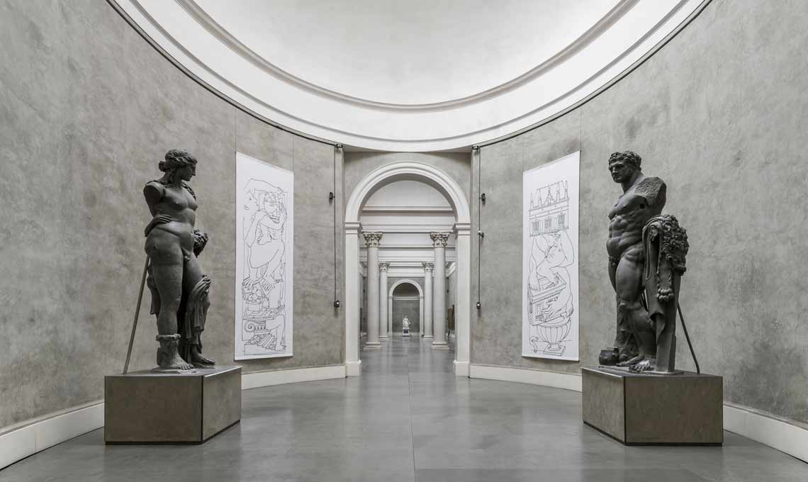 Fornasetti Theatrum Mundi. Complesso Monumentale della Pilotta, Ingresso Teatro Farnese (a sinistra) e particolare della Galleria del Teatro (a destra), Parma.