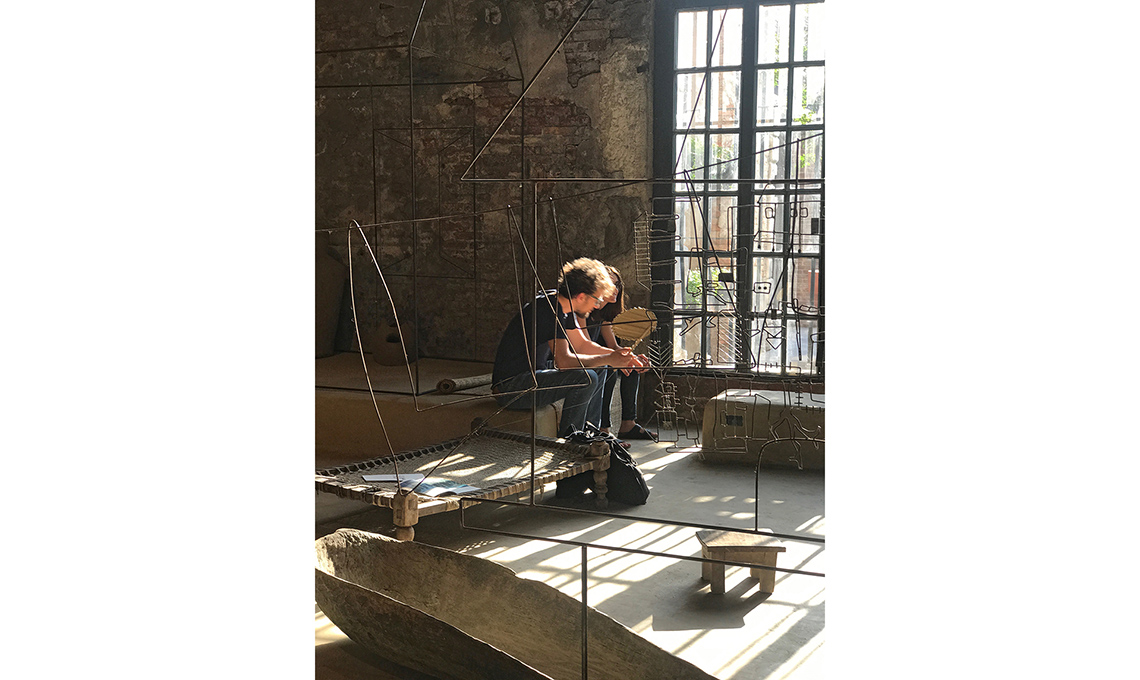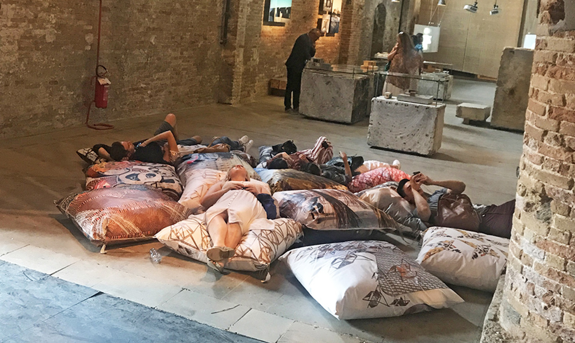 Momenti di relax: la Biennale Architettura è anche questo. Sdraiarsi in compagnia, sotto e ‘dentro’ l’opera ‘Weaving Architecture’ di Benedetta Tagliabue.