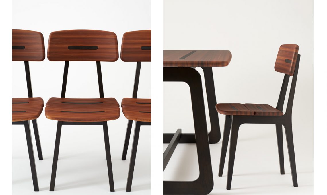 Le sedie e il tavolo in legno, presentati in una delle salette, sono stati progettati da atelier oï utilizzando legno di sugi, solitamente disdegnato nella produzione di mobili: grazie ad una innovazione tecnica, il legno è diventato più rigido, e grazie ad una lavorazione artigianale la superficie ha conquistato una texture davvero piacevole al tatto.