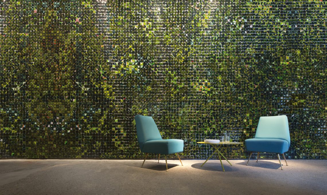Per l’esterno sono stati presentati morbidi pouf con imbottitura in sfere di polistirolo; tavoli con struttura in acciaio inox Délabré e piano in pietra lavica decorata con vetro fuso: le piastrelle sono tutte pezzi unici e sono selezionate per essere abbinate tra loro secondo criteri estetici suggeriti dalle sfumature di colore ottenute.