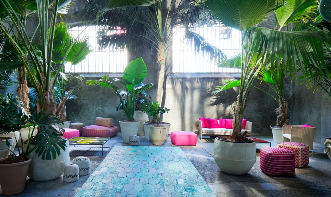 Un allestimento mozzafiato con tante piante tropicali in uno spazio industriale di inizio Novecento
