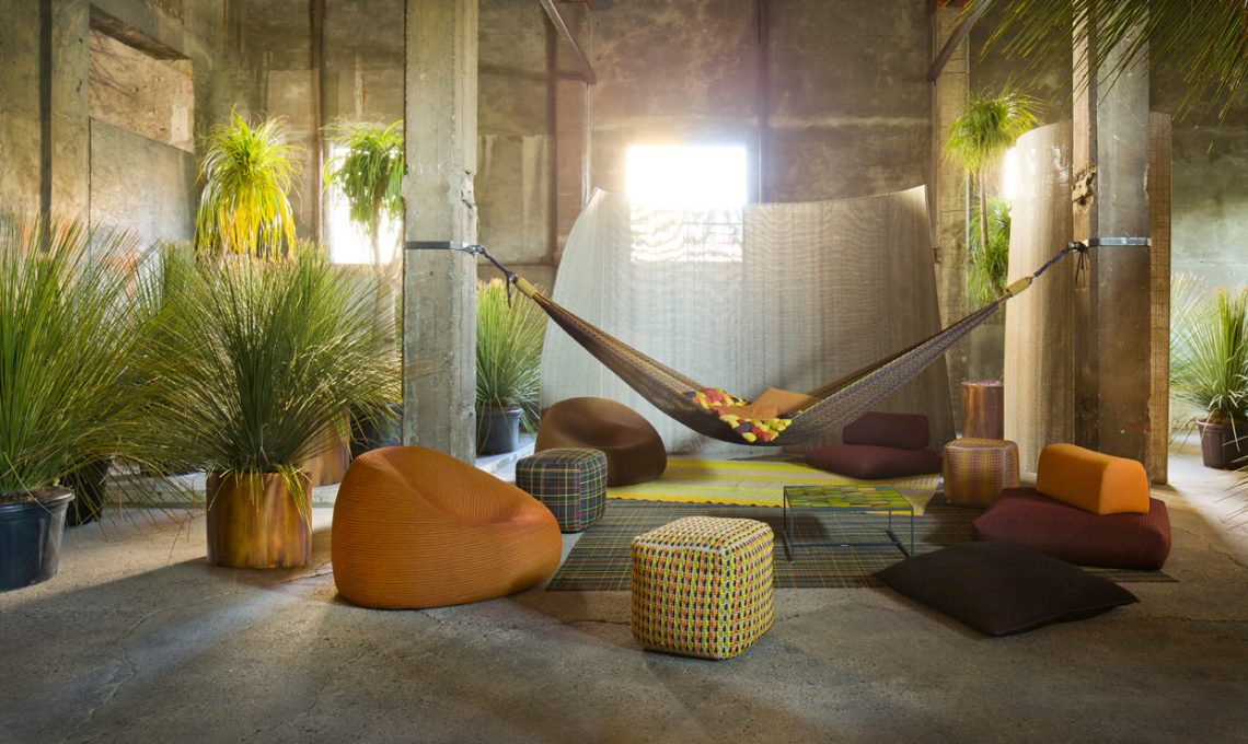 Inoltre, l’amaca Farniente, realizzata completamente in un nuovo tessuto multicolor per esterno, e la serie di tappeti per esterno, progettati con un sistema modulare realizzati dall’unione di strisce di tessuto ricamate.