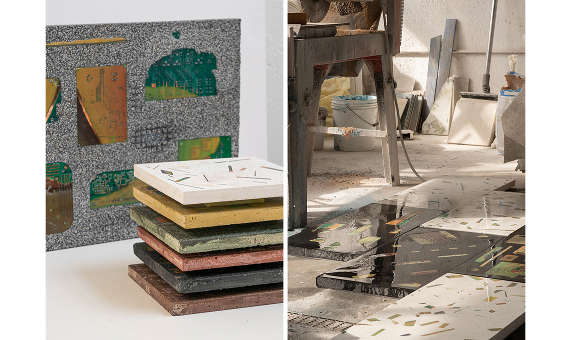 Una collezione di tavolini, sedute e pavimentazioni ispirati al celebre terrazzo alla veneziana ma realizzati da Fantini Mosaici con scarti di chip e schede elettroniche.