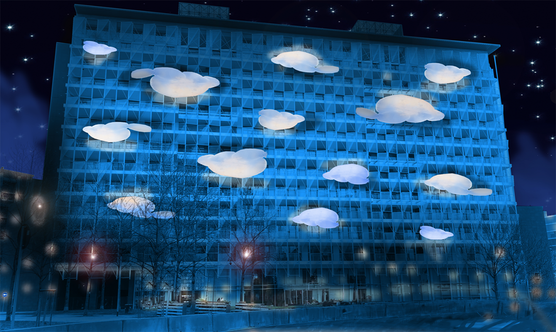 Urban Up | Unipol vuole testimoniare il proprio impegno nell’ambito della sostenibilità ambientale attraverso una maxi-installazione dedicata al tema dell’aria. 'Il respiro dell’aria' progettato da Studio Azzurro trasforma De Castillia 23 in un cielo verticale grazie a 12 nuvole 'magrittiane' installate sulla facciata del building illuminata di azzurro [via De Castillia 23].