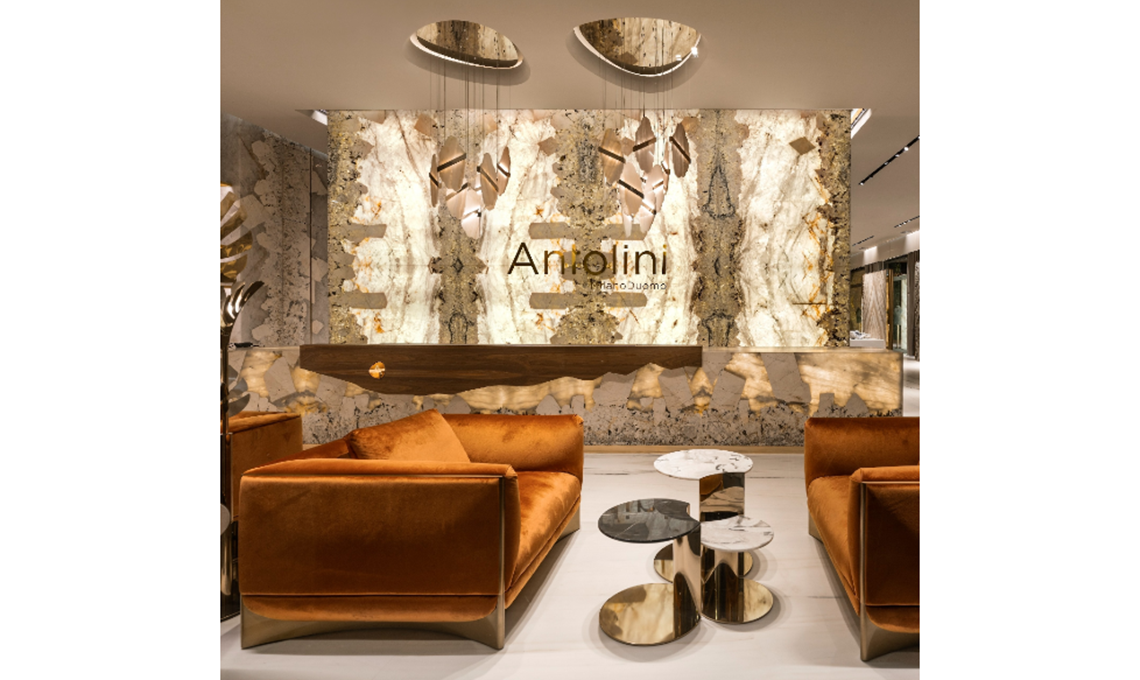 Antolini® presenta Way of Wonder - Cristallo Vitrum 'Wow': un Natural Quartz che ricorda una lastra di ghiaccio perenne dalle venature ambrate che, insieme ai giochi di trasparenze sulla sua superficie, creano un continuo movimento capace di incantare gli occhi di chi guarda [Piazza Fontana, angolo via San Clemente].