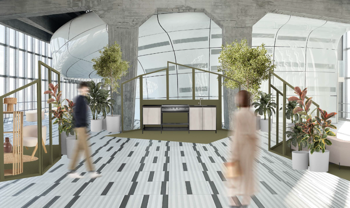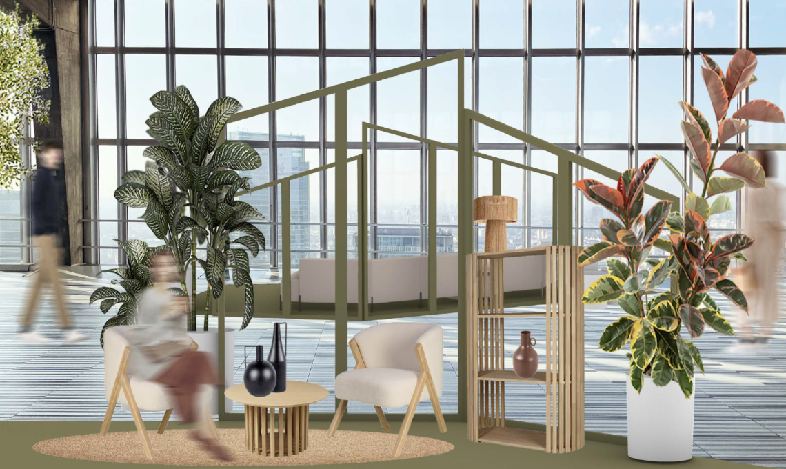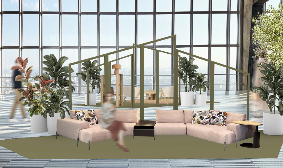 Sfruttando al meglio il suggestivo panorama che offre la location, Studio Pisk ha creato un allestimento che invita alla contemplazione e al relax, offrendo un rifugio dal caos della manifestazione. L'allestimento accoglie i visitatori con confortevoli salottini disposti strategicamente per godere appieno della vista mozzafiato. Circondati da piante verdi, scelte appositamente per il loro effetto rilassante, i partecipanti possono rilassarsi e lasciarsi trasportare dalla bellezza del paesaggio urbano di Milano.