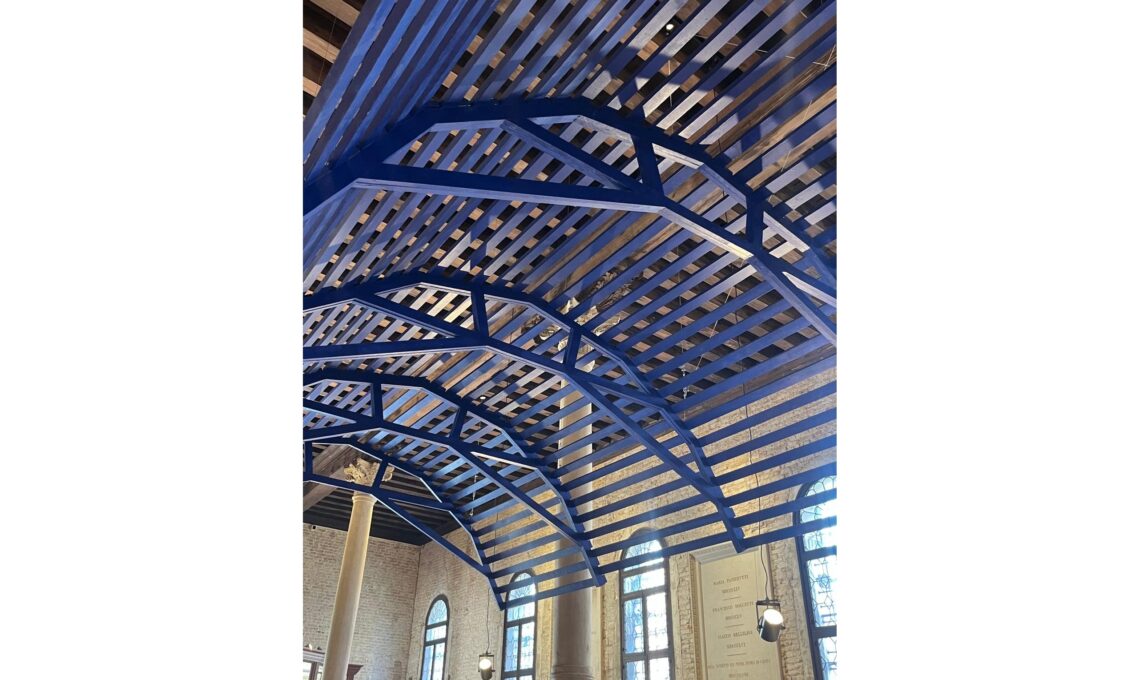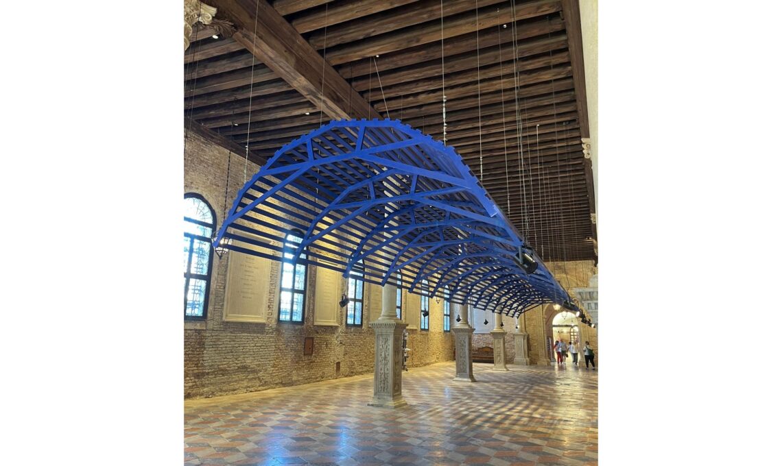 La scultura architettonica sospesa, composta da listelli di legno blu oltremare, dialoga con il plastico originale del progetto di Le Corbusier per il nuovo ospedale (1963-1970). Collocata nella maestosa sala d’accoglienza Portego delle Colonne, l’opera invita chi osserva a riflettere sul legame tra arte, bellezza e salute, trasformando lo spazio in un luogo di contemplazione e conforto.