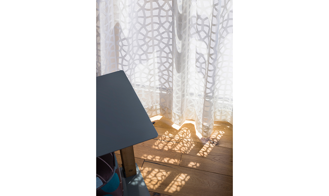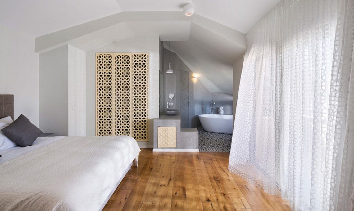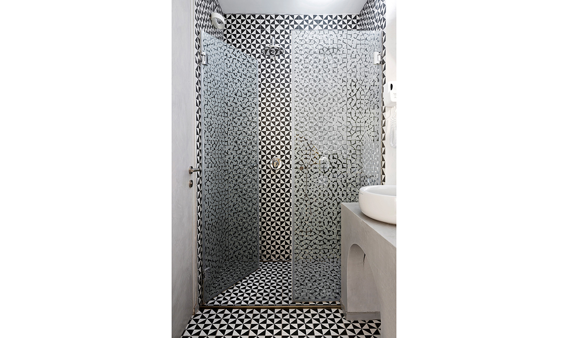 Un altro elemento d’arredo ripreso dalla tradizione araba è l’uso grafico del motivo della Mashrabiya (sistema di raffreddamento), lo troviamo come stampa sulle tende della camera da letto e come serigrafia sul cristallo della doccia.