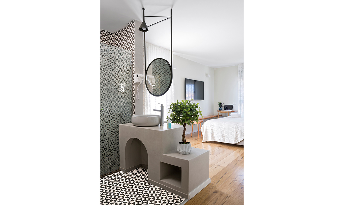 La camera da letto e il bagno non hanno pareti divisorie, la separazione fra gli ambienti avviene grazie al cambio di pavimentazione, nella camera viene proposto il parquet (e in alcuni casi delle meravigliose piastrelle verde acqua), mentre nella zona bagno sono posate piastrelle ispirate alla tradizione di Jaffa ed interpretate secondo geometrie contemporanee che creano un effetto optical.