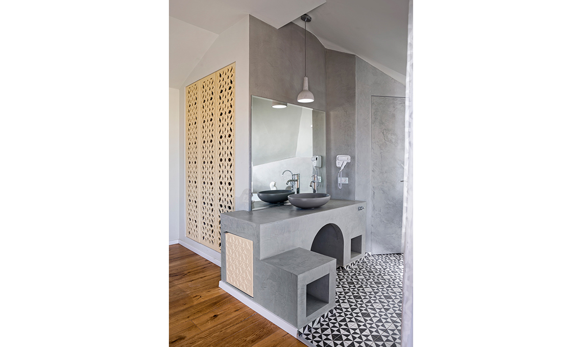 Il piano del lavabo e lo specchio invece, separano fisicamente camera e bagno, il piano è realizzato con una struttura in cemento autonoma sigillata con intonaco Tadlakt (tradizionale intonaco resistente all'acqua).