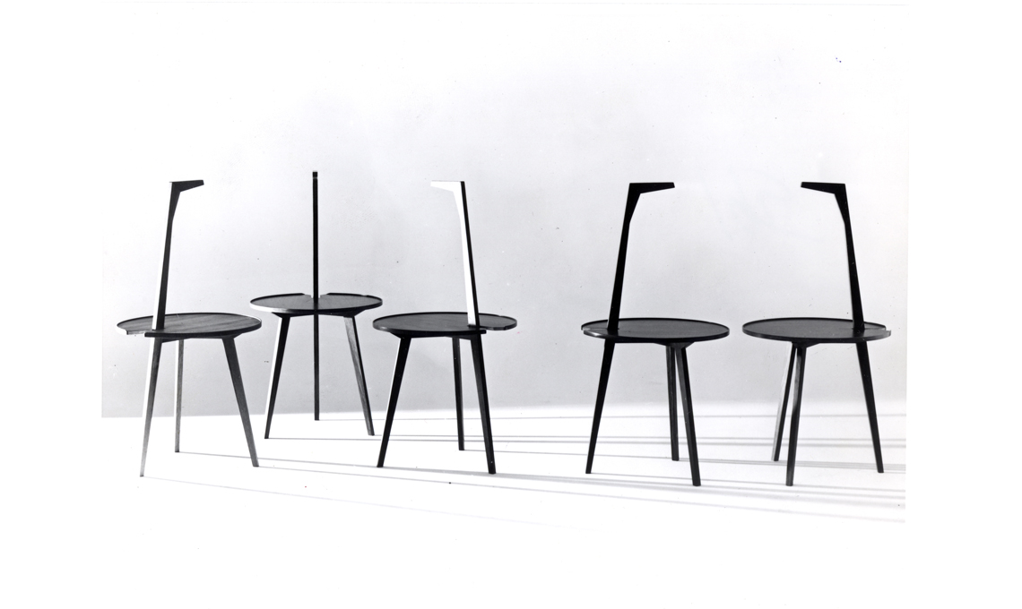 Nato per essere un tavolino ‘servomuto’, da spostare agilmente di stanza in stanza, ha tre gambe, una delle quali prosegue e si trasforma in ‘manico-becco’, rendendone facile il trasporto.
