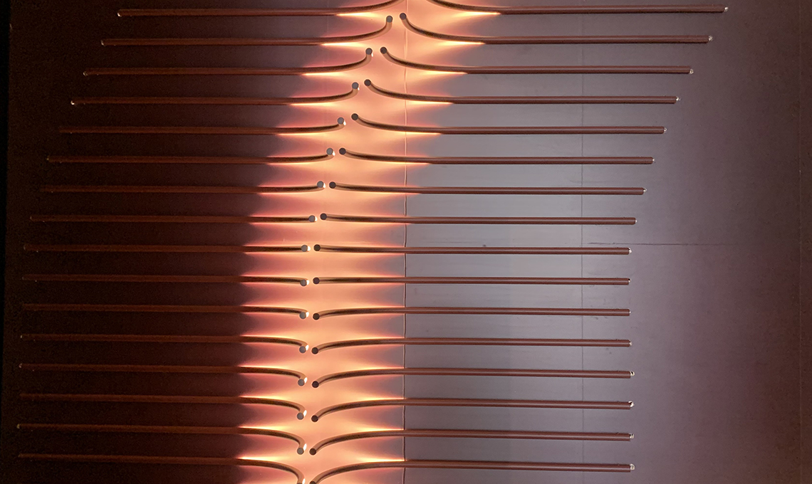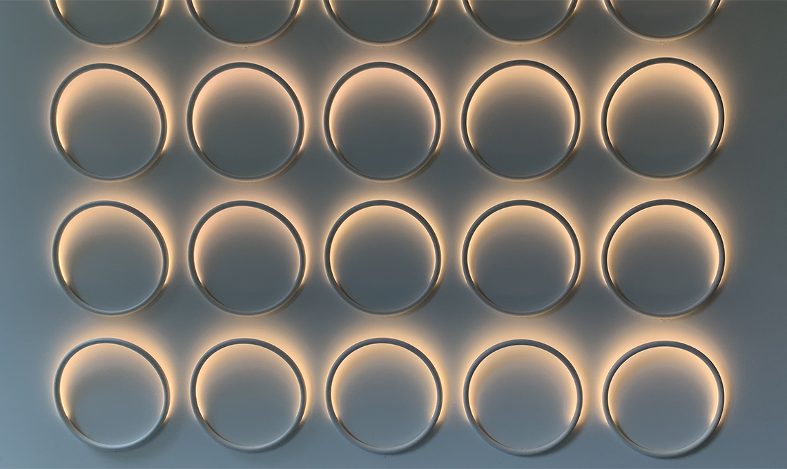 Quando le lampade sono accese, emettono una luce calda che cambia l'atmosfera della stanza; quando sono spente, diventano oggetti scultorei in grado di caratterizzare qualsiasi ambiente. Il design di entrambe le lampade è accentuato dal modo in cui si stagliano dalla parete con le loro forme curve, una caratteristica ricorrente nel lavoro di Sabine.
