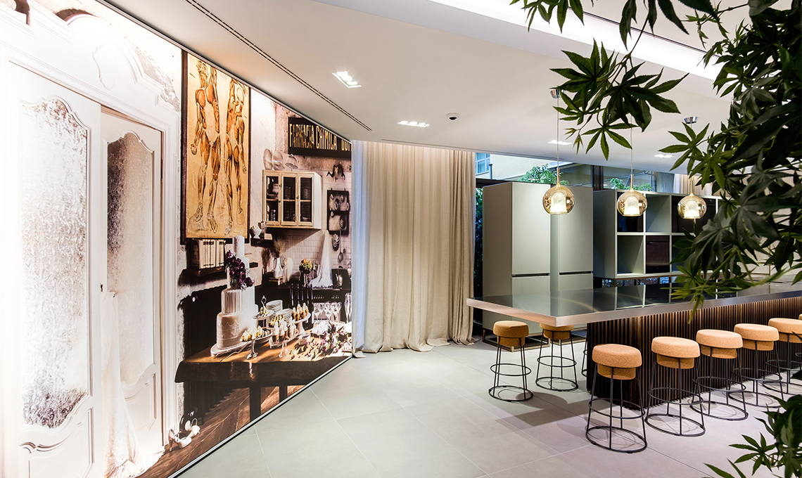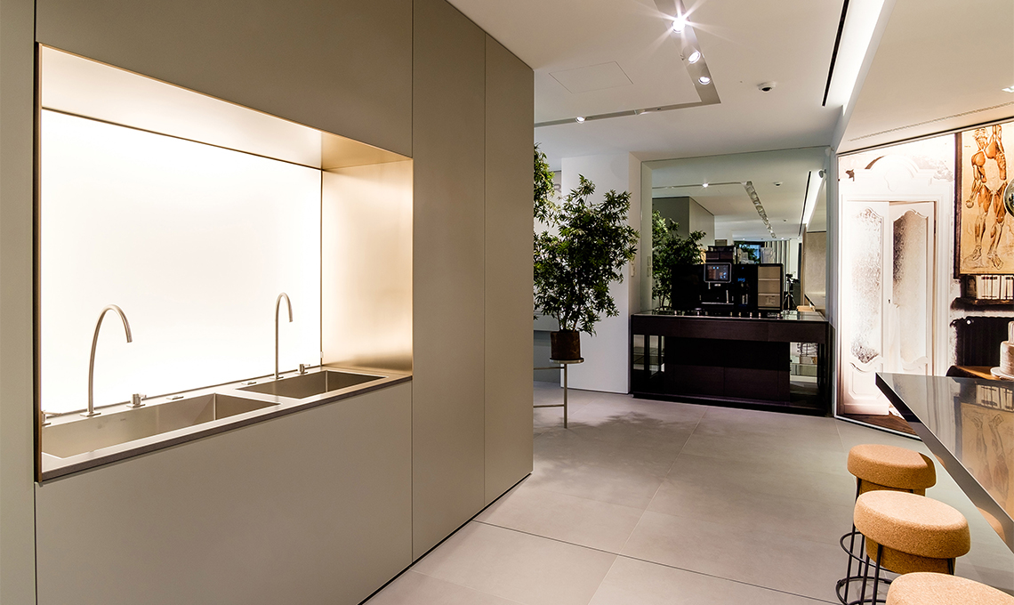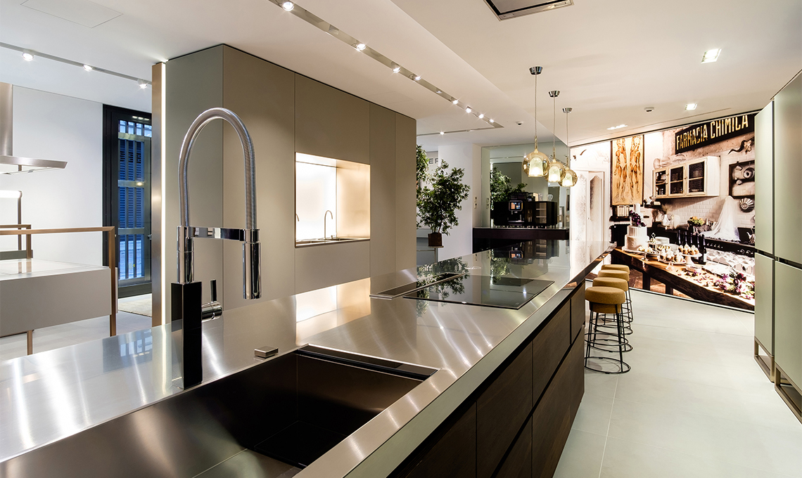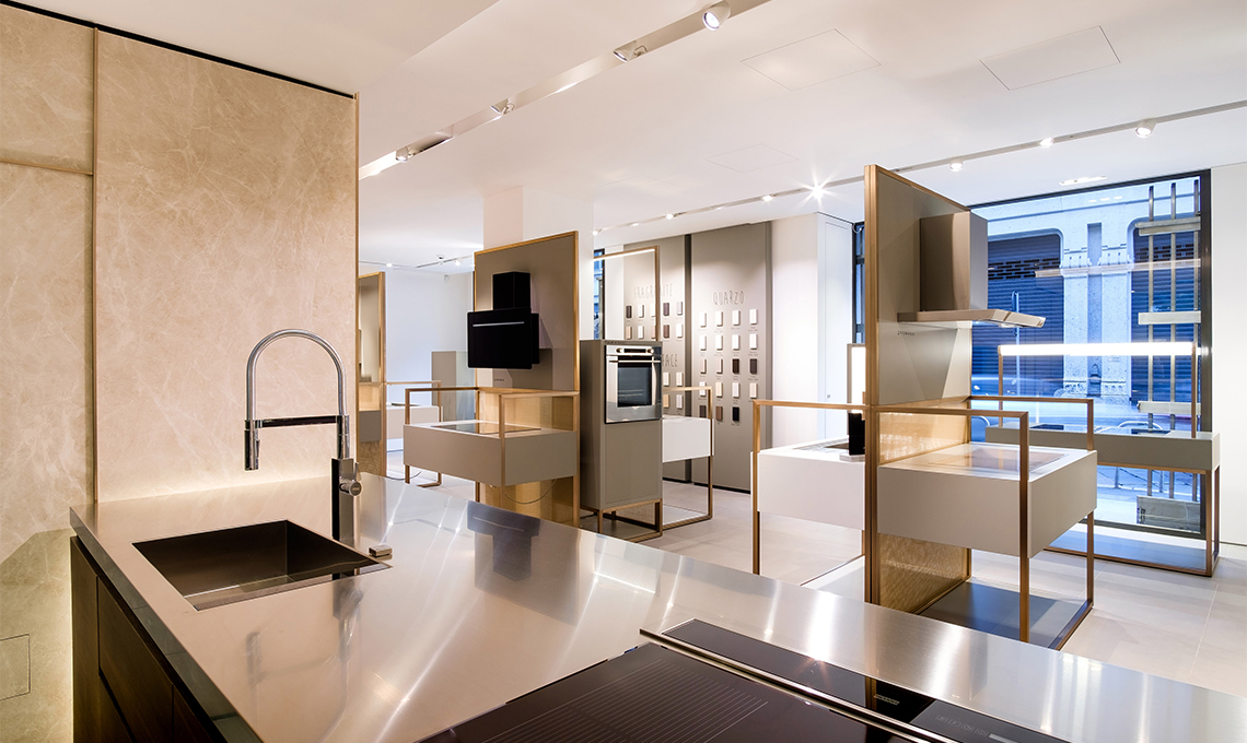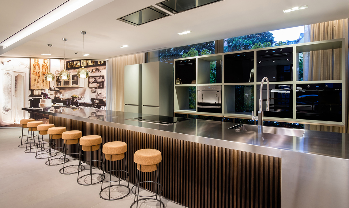 Curato dall'architetto Carlo Colombo, che da anni collabora con l'azienda, lo showroom integra una gigantografia del fotografo milanese Pietro Baroni, che fa parte di una collezione di immagini di cucine del mondo. Anche grazie a questa scelta artistica, lo showroom ricrea un ambiente intimo e domestico in cui gli elettrodomestici sono protagonisti e "motore" di tutto ciò che avviene in cucina. Dietro il lungo bancone isola, una cucina perfettamente funzionante ospiterà showcooking ed eventi (il primo per l'inaugurazione tenuto dallo chefBruno Barbieri).