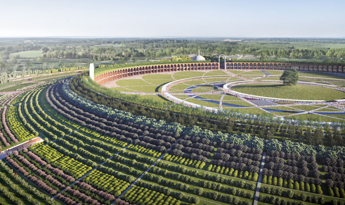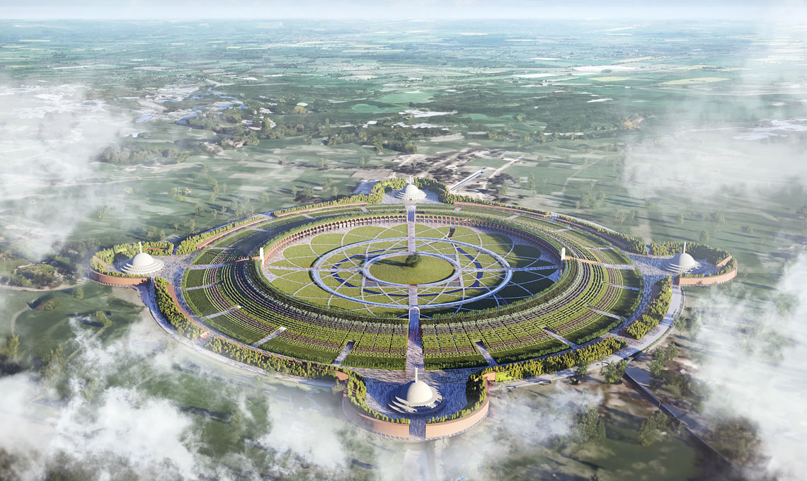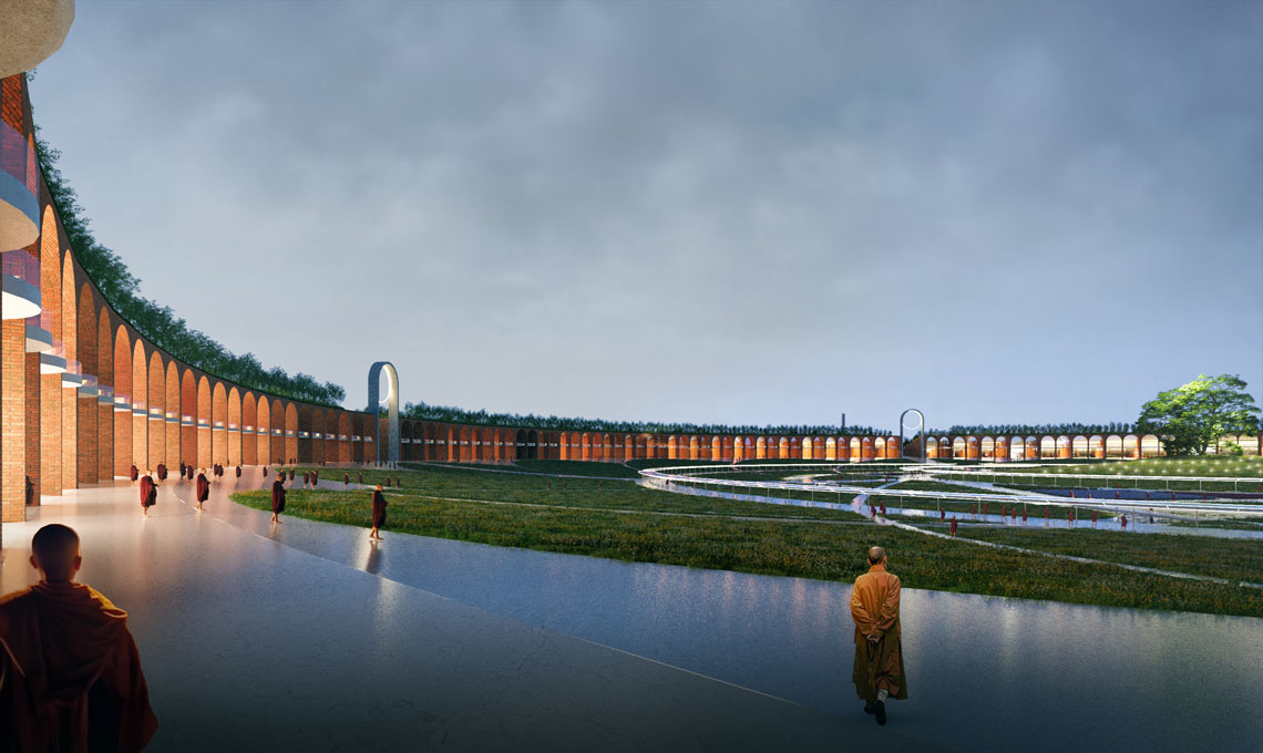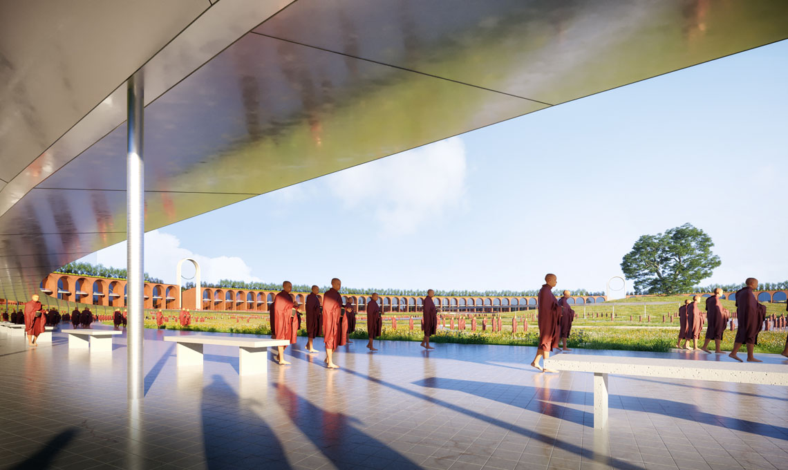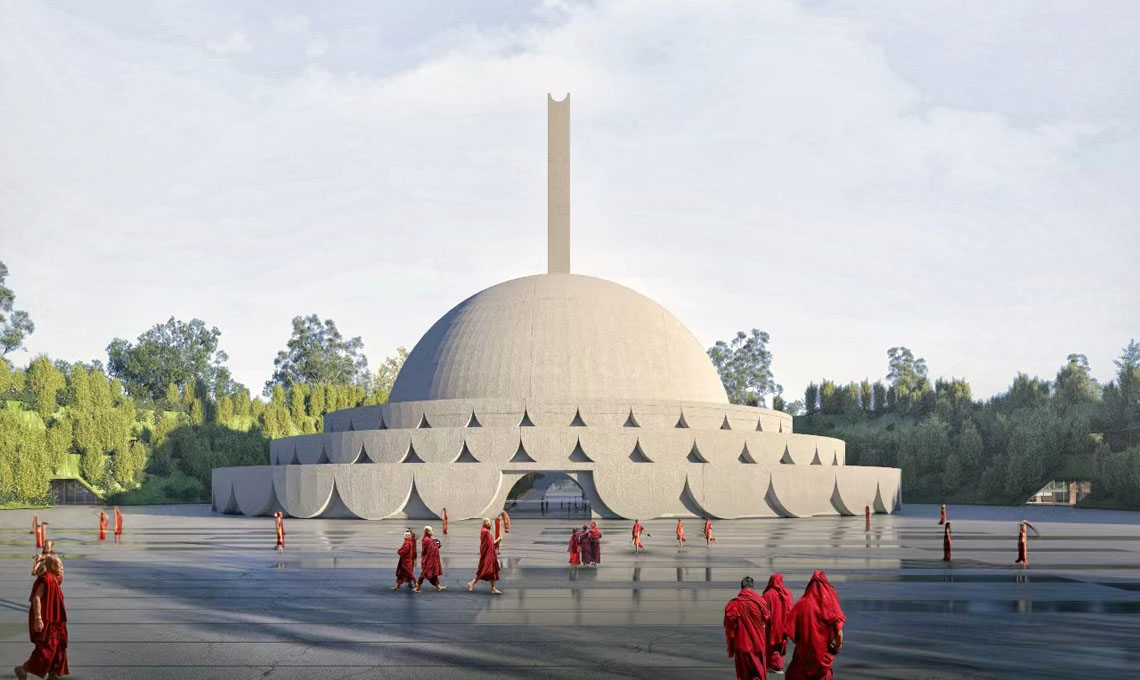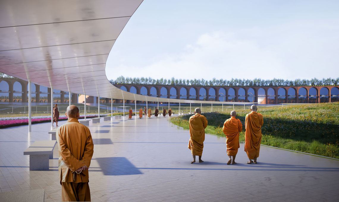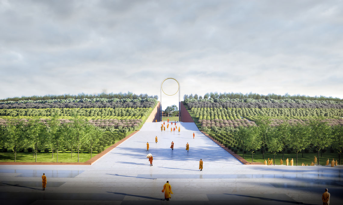 Il progetto propone un graduale avvicinamento al luogo sacro della religione buddhista, a partire dai quattro portali monumentali che, attraverso il ‘giardino della biodiversità’ – il pendio vegetato – conducono al centrale ‘prato della pace’ di 600 metri di diametro circondato da un sistema circolare di strutture, spazi culturali e aree per la meditazione. Al centro di questa geometria il Bodhi Tree, l’albero sacro della tradizione buddhista, e lo Stupa del Buddha.