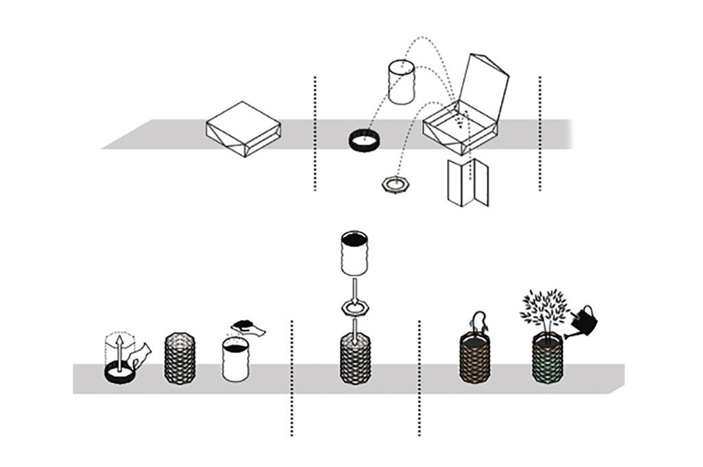 Il cilindro si monta su una base e viene protetto all'interno da un sacchetto impermeabile ma traspirante; attraverso questo, il cartone registra il grado di umidità della terra e lo comunica con le diverse tonalità del blu.