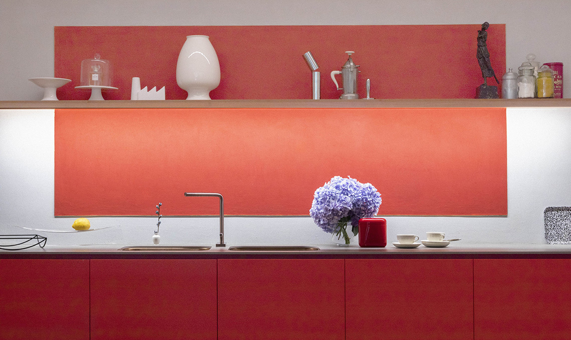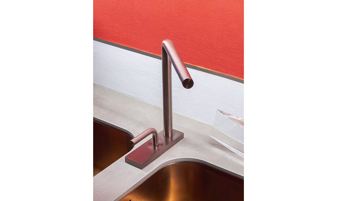 Ron Gilad per dare vita alla ‘GP Kitchen’ per una casa di ringhiera  nel quartiere Isola di Milano, si è ispirato a ‘Orange and Yellow’ di Mark Rothko! E ha inserito il rubinetto Levo di Quadro, essenziale, nella speciale finitura Pvd Rose Gold.