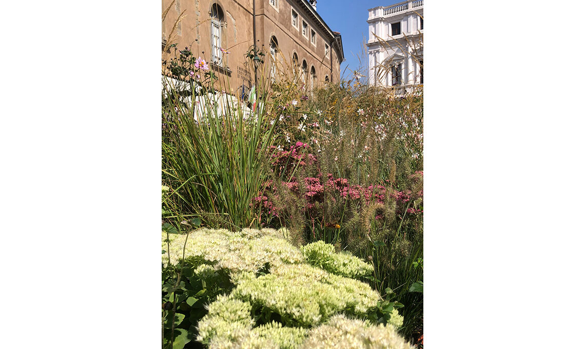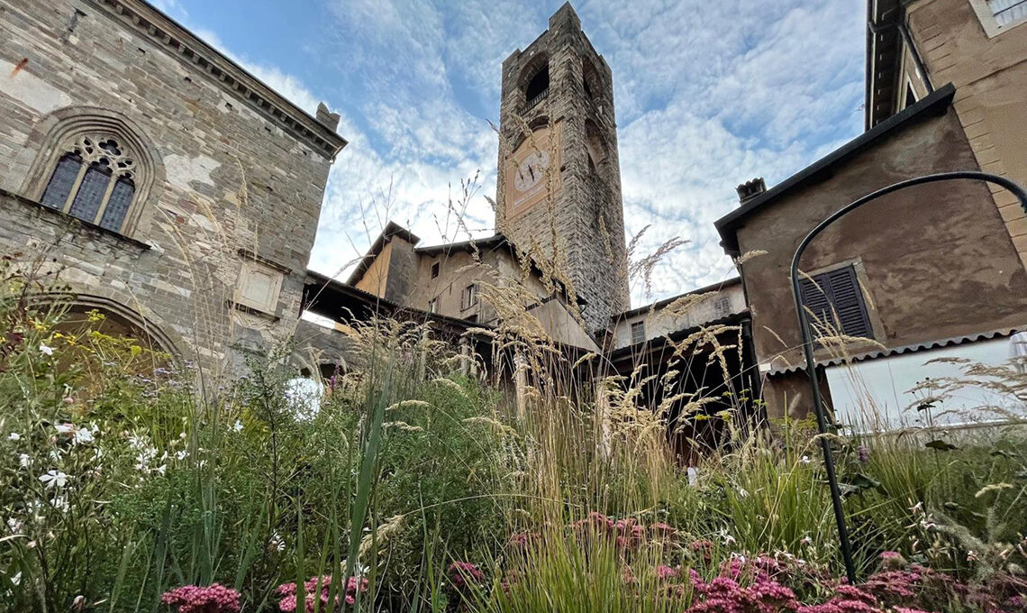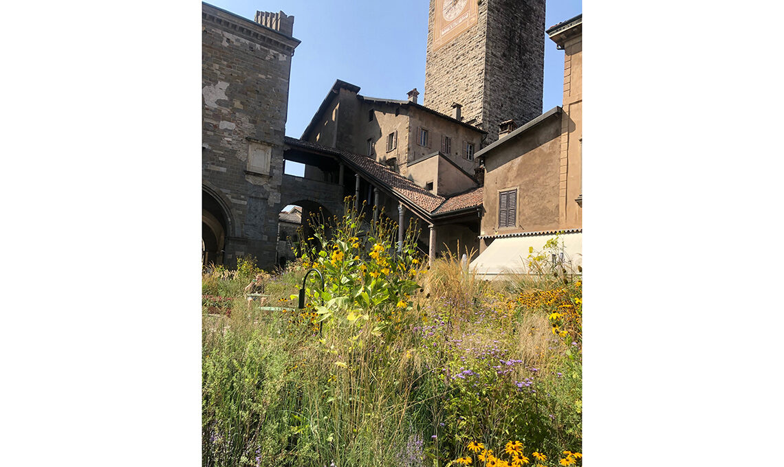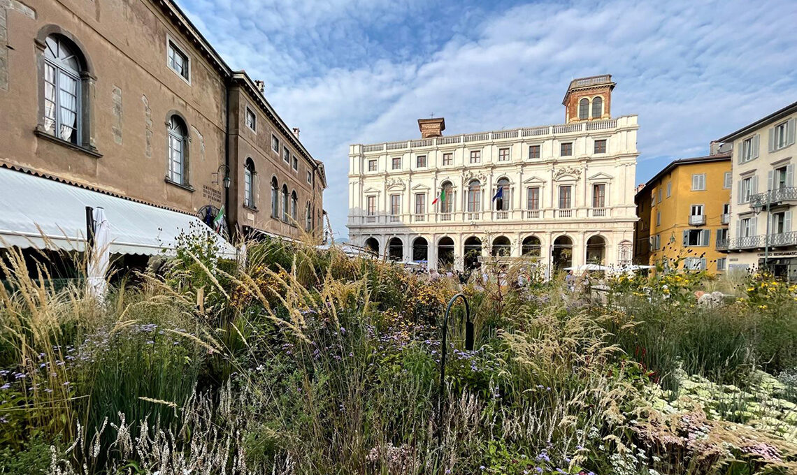 È opera sua ‘Green Square’, la trasformazione di Piazza Vecchia in un campo fiorito, con la messa a dimora di ben 15 mila piante e 70 diverse varietà! Un campo fiorito costellato da anemoni bianchi, rudbeckie gialle, verbene e aster viola che svettano in un apparente disordine fra le spighe delle graminacee.