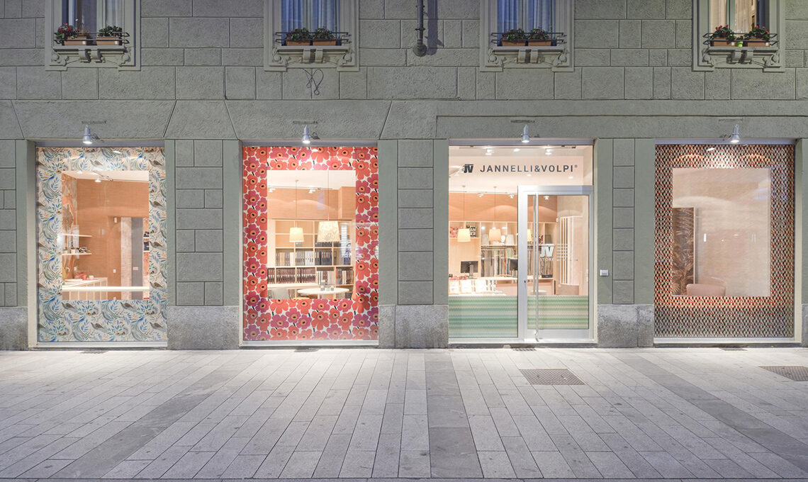 Jannelli&Volpi sbarca in Corso Garibaldi 81 con quattro grandi vetrine su strada, nello shop che parla al pubblico di wallcovering e interior design.